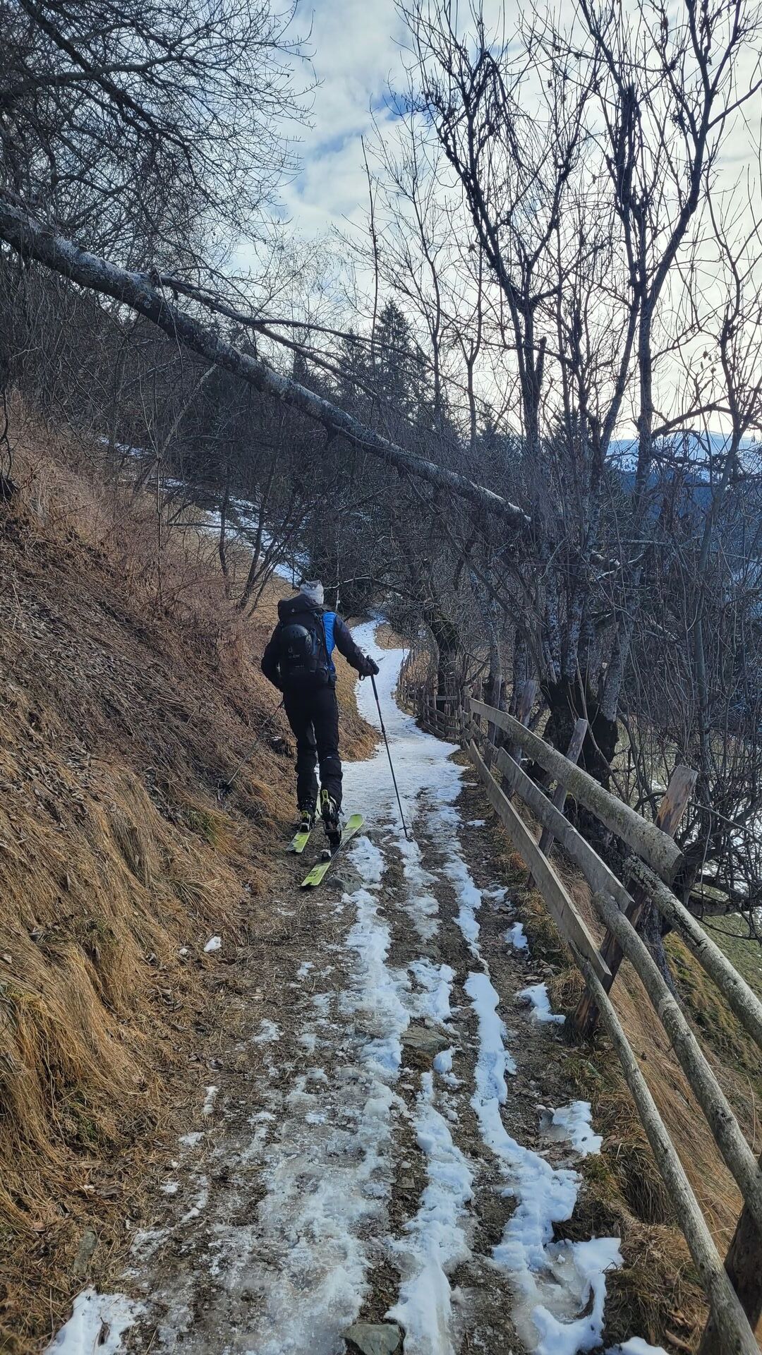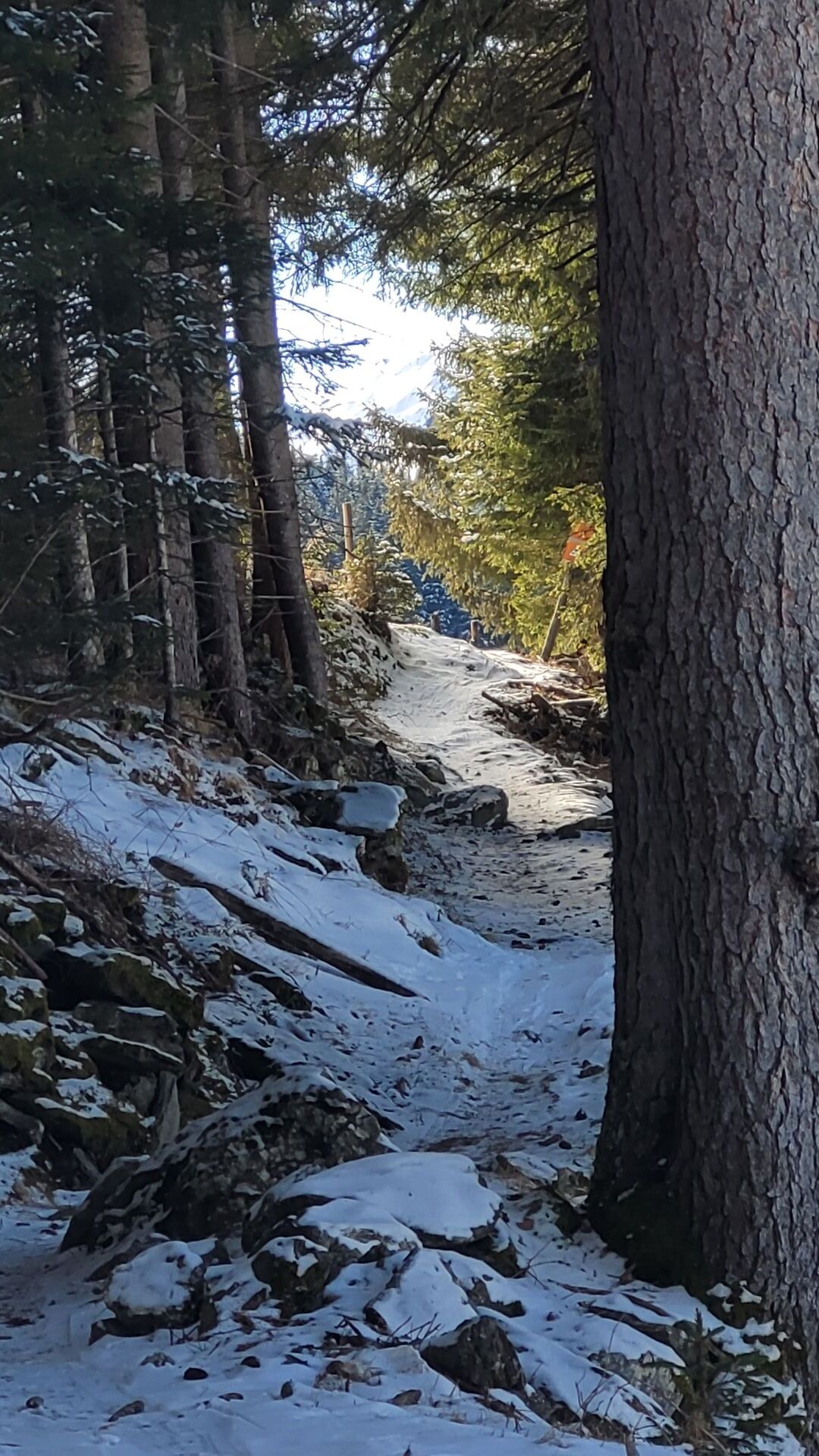 Hauchdünne Schneeauflage im Wald. Zum Aufsteigen reichts.