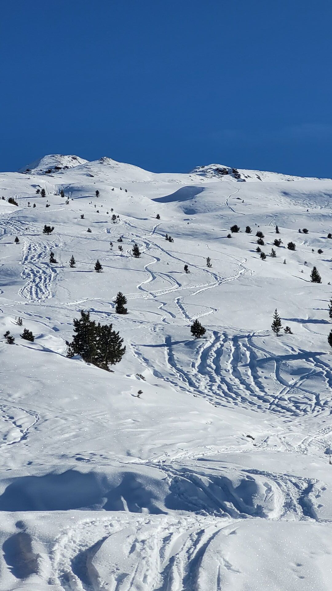 Weitere Abfahrt bis zur Fiderissalm bei überlegter Spuranlage genußvoll in sehr gutem Pulver, danach wird's etwas heikler. Der Fahrweg unter der Hochsinnalm ist mit etwas Vorsicht gut befahrbar, außer die letzten Meter nach der Kehre, weil er dann südseitig exponiert ist. Der Fahrweg von der Weidener Hütte ist guten Gewissens nur dort befahrbar, wo er nicht unter Bäumen verläuft.