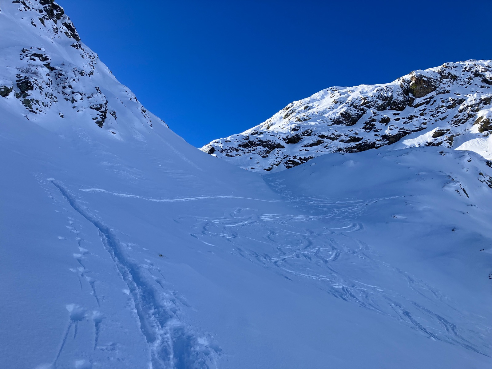 Dank einer Dreiergruppe war bis zum Schlappiner Joch bereits gespurt und der Rest dann dank einer großen Schweizer Splittboardergruppe fast schon eine "Autobahn". Die steile N-O-Rinne habe ich die besagte Gruppe gerne vorgelassen, weil wenn die Rinne nicht eingefahren gewesen wäre, hätte ich mir die bei der Lawinenlage wohl kaum getraut. So gab es dann in den schönen Hängen nach der Rinne tollen Pulverschnee und ausnahmsweise mal keinen Steinkontakt. Früher waren doch im Idealfall die meisten Hochwinter-Skitouren so ...