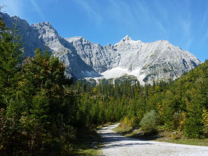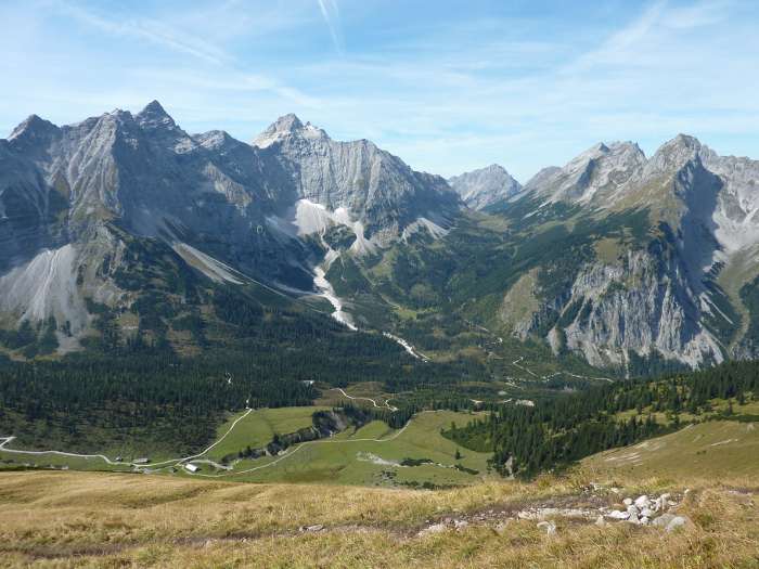 Tourenverhältnisse: Auffahrt bis Höhe kl. Ahornboden moderat, dann wird es durch den Schotter mühsamer. Ab Ladizalm Schiebestrecke u. Weiterfahrt zur Falkenhütte, Radl-Depot.