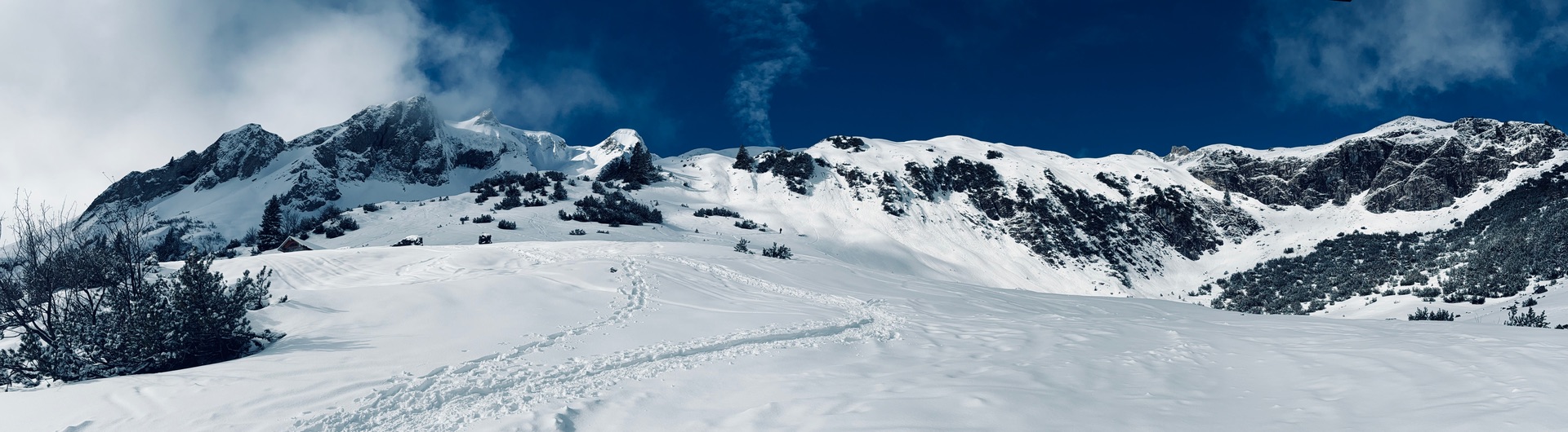Ab der Käser-Alpe dann wieder auf die Ski. Etwas später, so gegen 1600 Meter dann 10-15 cm frischer Pulver auf stabilem Grund. Das Gelände war zumindest heute komplett unverspurt. Überraschend viel Schneeschuhgeher waren unterwegs. Aber die tun ja nix, und stapfen in der gleichen Spur rauf und auch wieder runter. Habe da dann auch kein Problem damit, wenn die die Aufstiegsspur platt walzen, war immer noch gut zu gehen und dann definitiv lawinensicher - Peace ✌️.