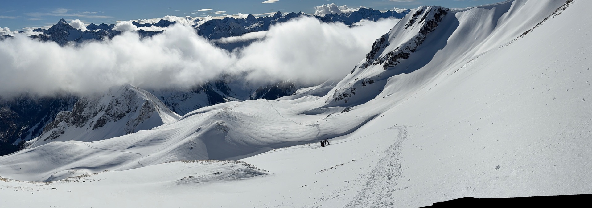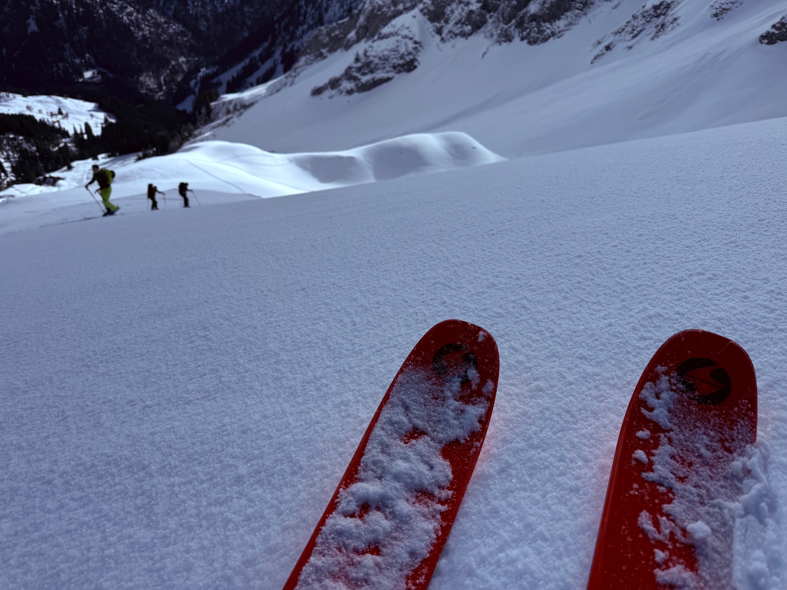 Obwohl das Allgäu mal wieder seinem Ruf als Schneeloch gerecht wird, gibt’s natürlich auch hier erschreckend viele ausgeaperte Hänge. Aber ergiebige und lohnende Skitouren sind möglich, und das sogar südseitig. Das kann man aktuell wohl nicht von jedem Tourengebiet behaupten.