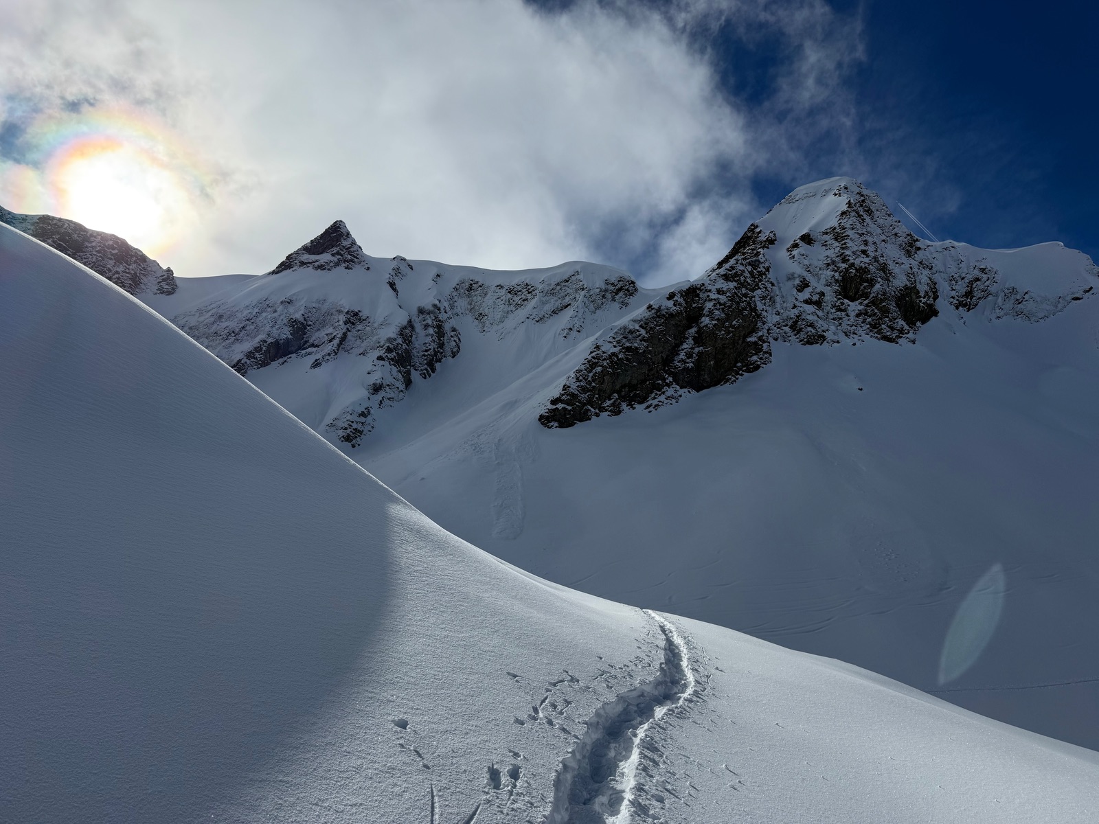 Die Abfahrt war dann top - gesetzter Pulver in unverspurten Hängen durchgehend bis auf 1600 m. Wird nach den warmen Temperaturen heut südseitig ab morgen sicher nicht mehr so sein. Aber dafür gibt’s ja dann noch die nordseitigen Touren.
