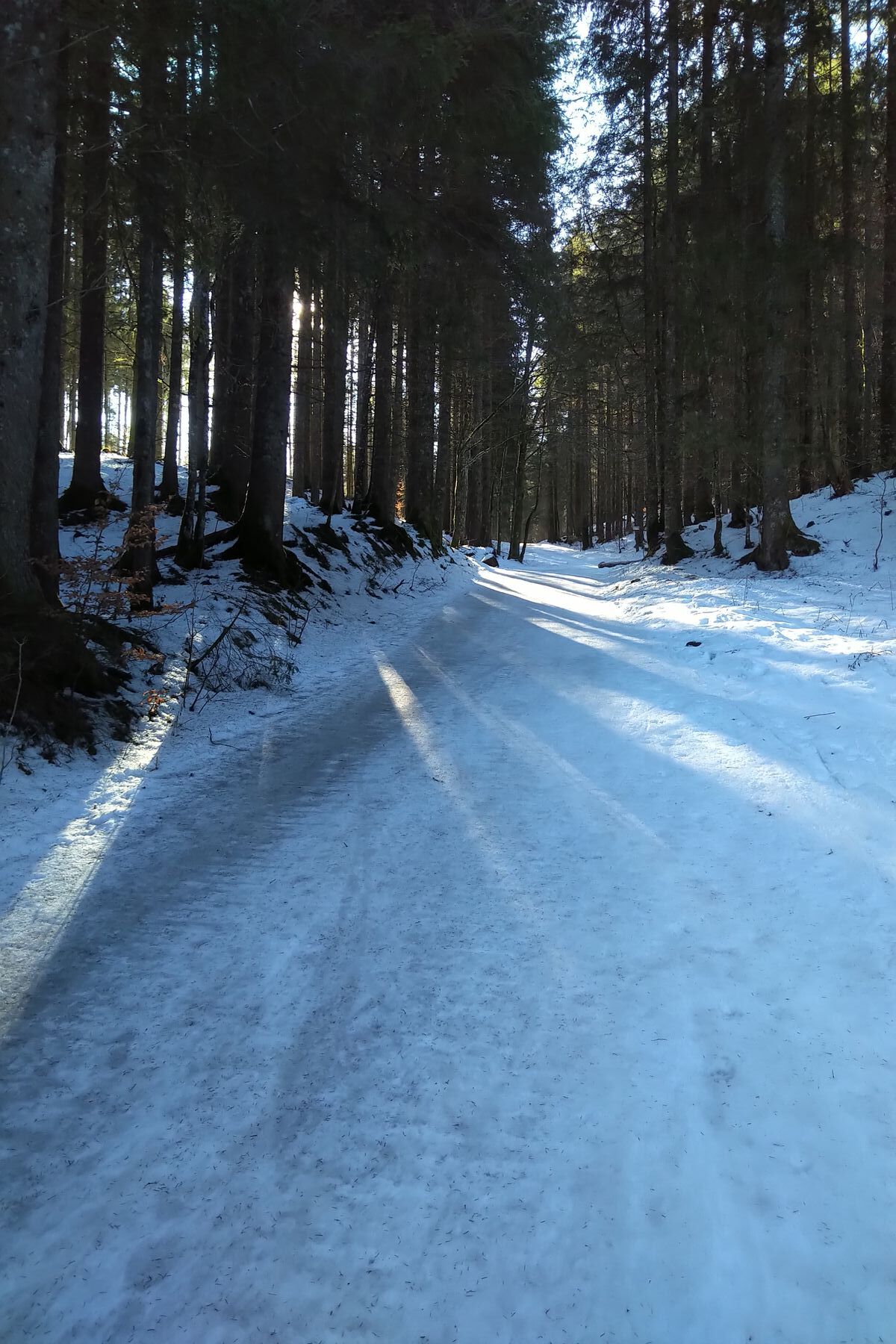 Unten auf der Forststraße ist noch eine Schneeauflage vorhanden (teilweise eisig, aber mit Ski gut zu gehen). Nur an wenigen Stellen wird die Auflage langsam dünn (weniger als auf diesem Foto):