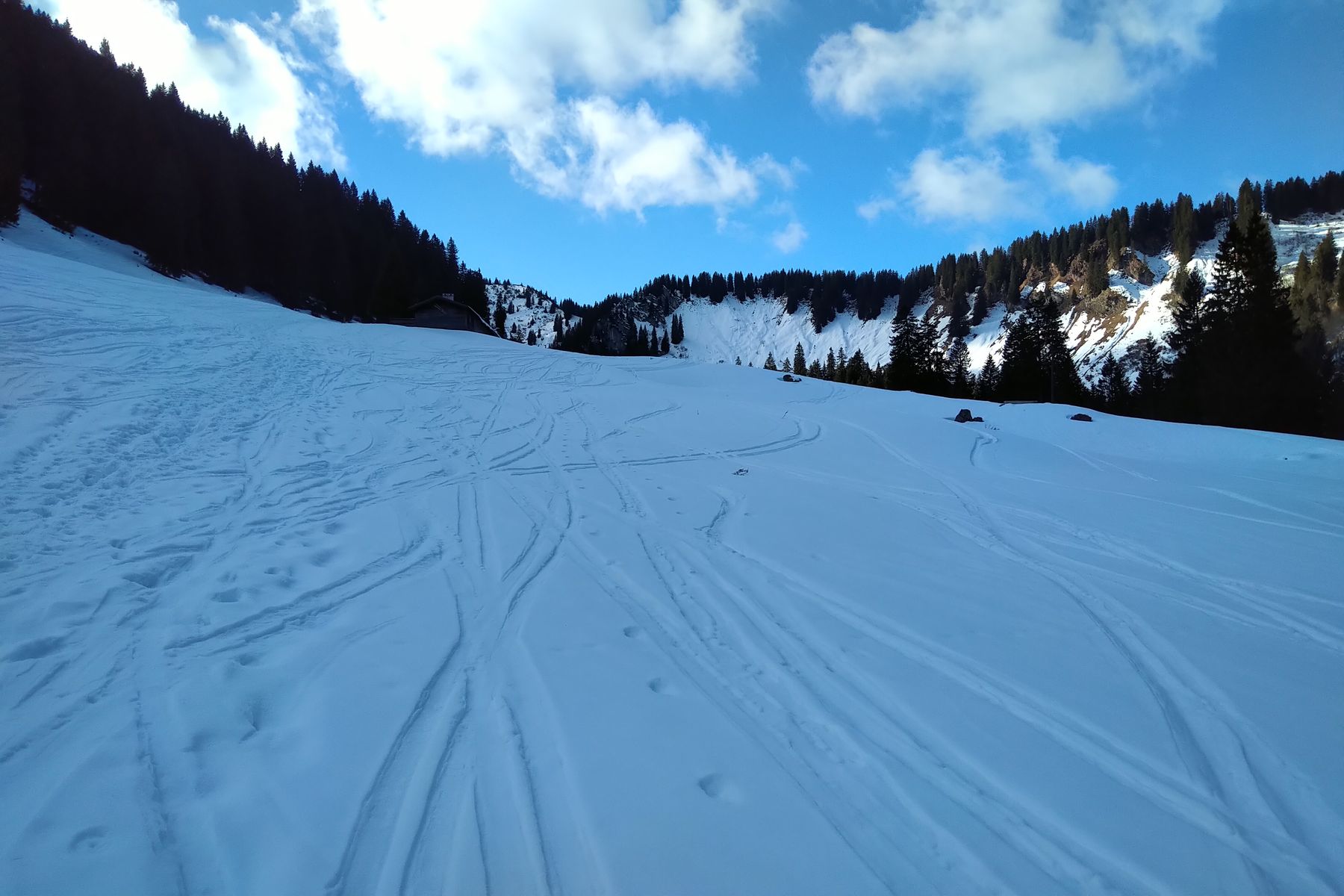 Blick auf den Osthang vom Blankenstein-Sattel. Der oberste Teil war noch am besten zu fahren: