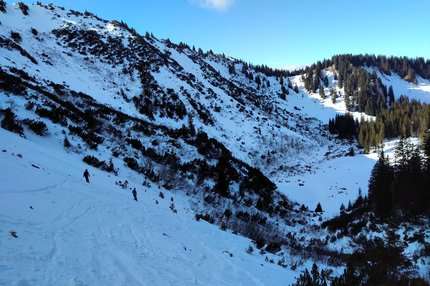 Blick zurück zum Röthenstein-See. Die übliche Aufstiegsspur verläuft weiter rechts (nördlich), aber ich wollte mir auch die mögliche Abfahrts-Option anschauen. Bei der Gruppe auf dem Bild sah es auch nach einer flüssigen Abfahrt aus: