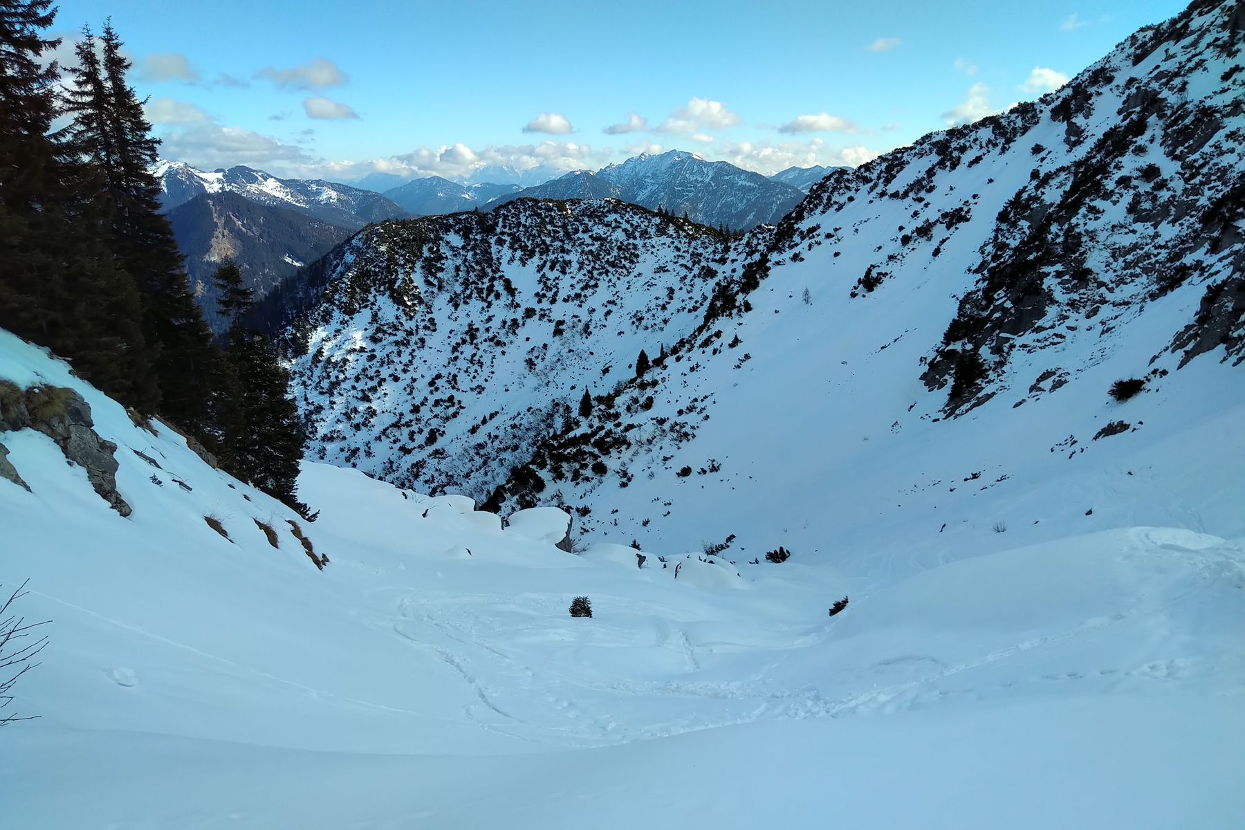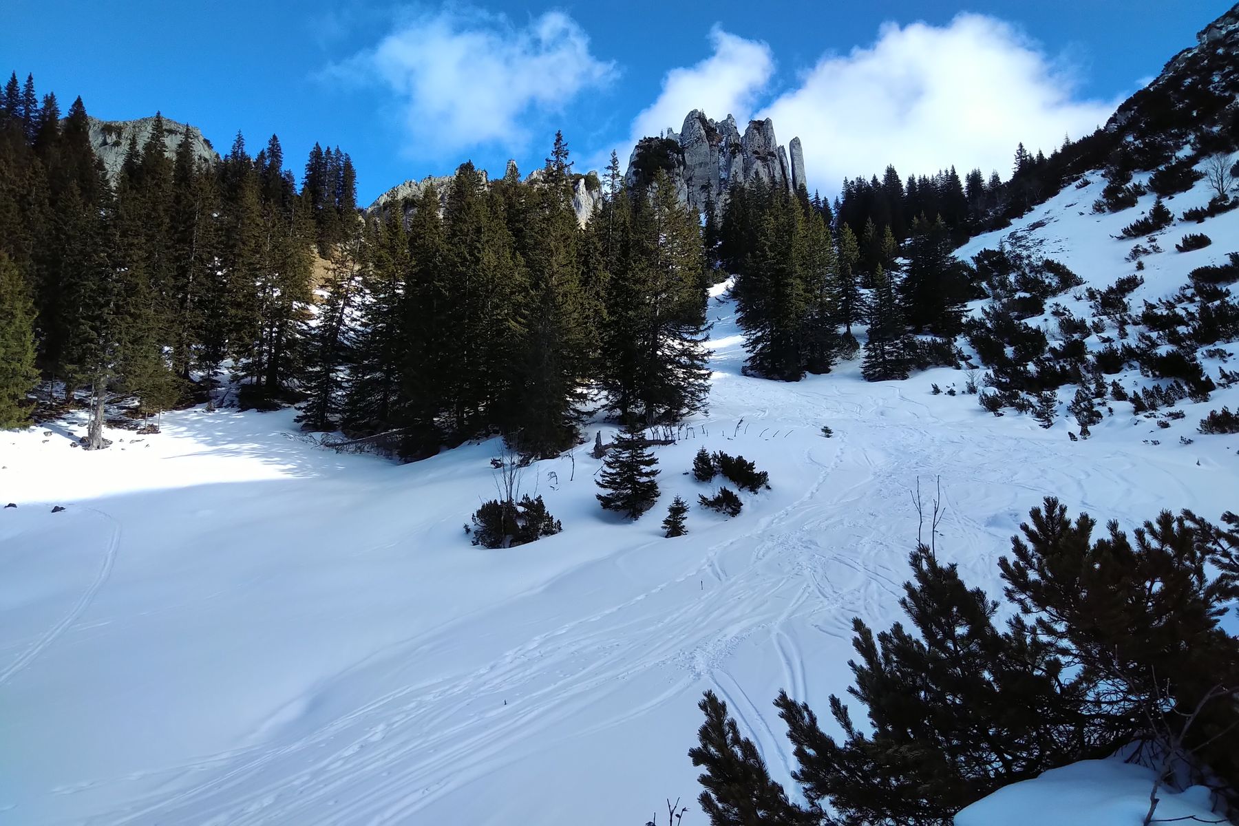 Bei der West-Abfahrt wurde von OK-Verhältnissen berichtet. Immerhin muss man sich dort weniger durch Engstellen im Wald / Latschengürtel wurschteln bei der Abfahrt.
