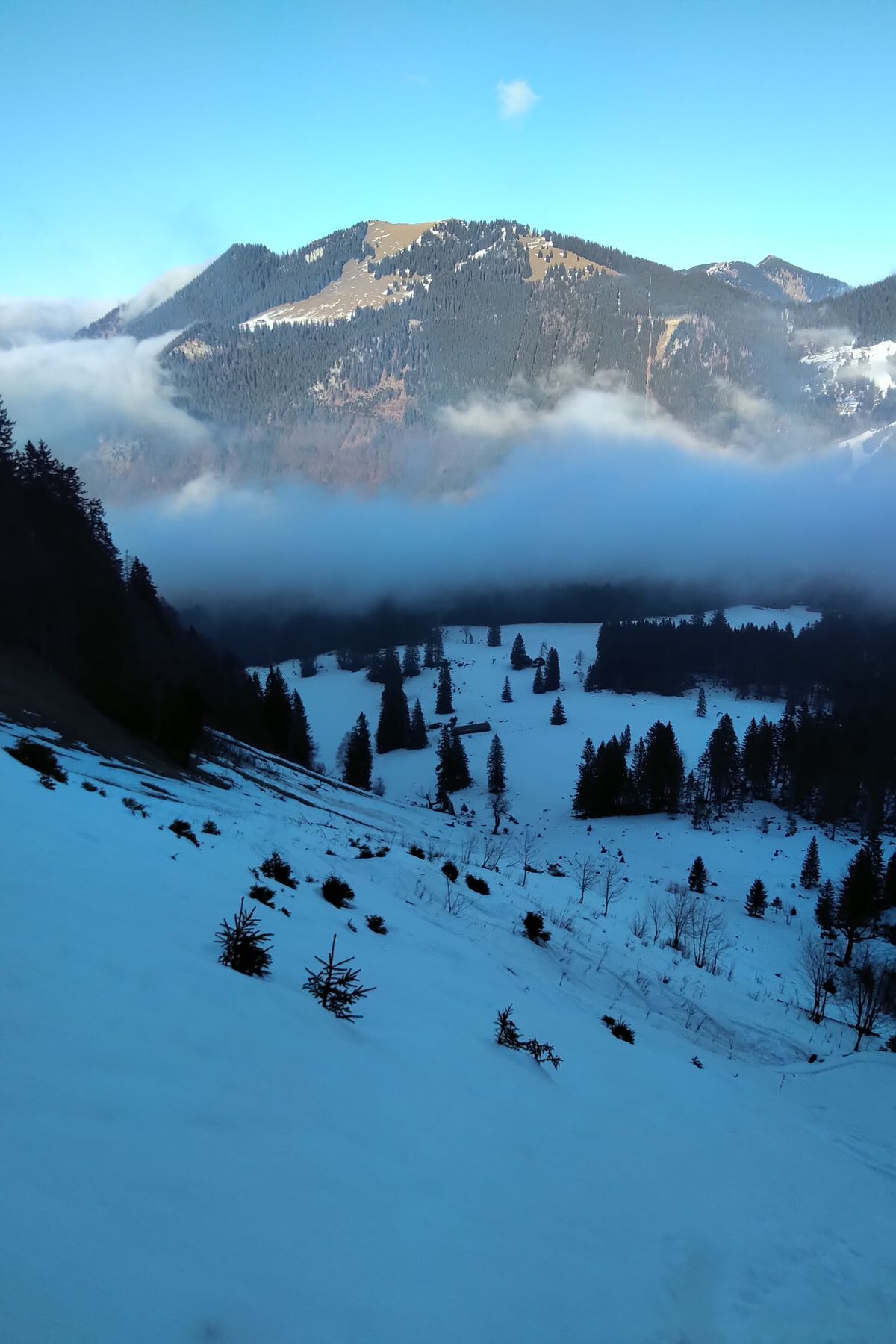 Alle anderen haben die Runde heute im Uhrzeigersinn gemacht, was bei den aktuellen Verhältnissen sicher sinnvoller ist. Wir wollten es aber andersrum versuchen. Die Richtung hat sich aber nicht gelohnt, da z.B. der Osthang vom Blankensteinsattel mittelmäßig zu fahren ist und das Geeier im Latschengürtel und später im Wald nicht aufwiegt.