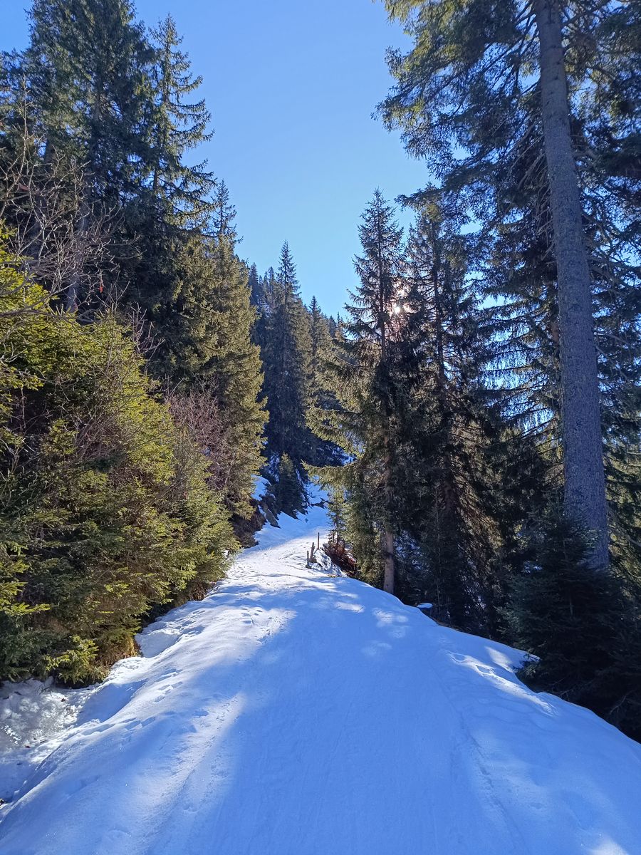 Anforderungen: Etwa 1100 Hm. Durch den umständlichen Forststraßenaufstieg darf man aber locker 3 Stunden rechnen. Skifahrerisch eigentlich recht einfach, wegen der geringen Schneelage und der dadurch bedingten Engstellen aber schon ein bisserl anspruchsvoller.