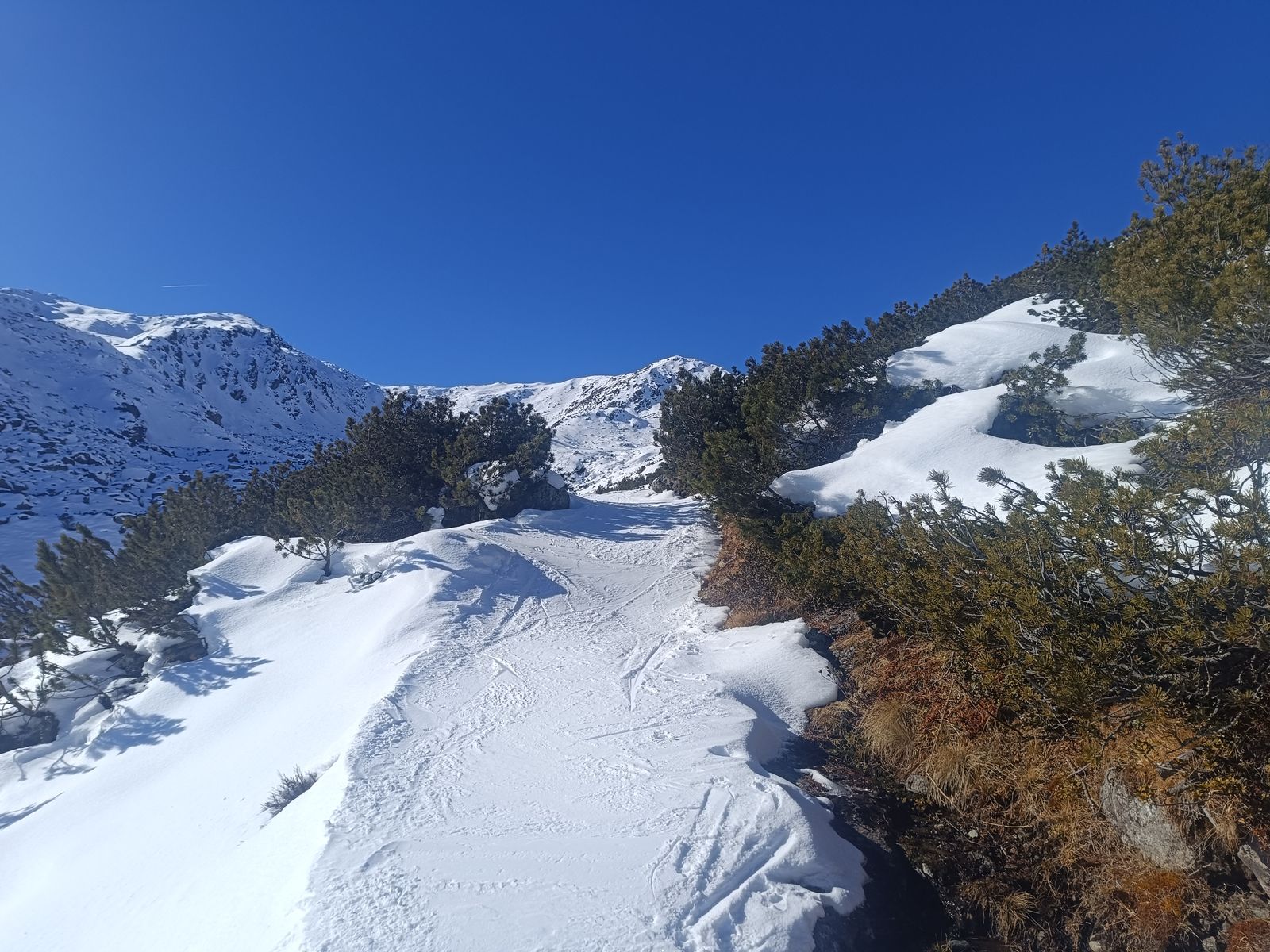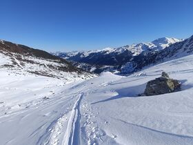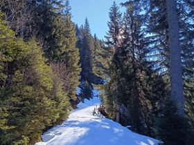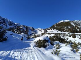 Verhältnisse: (Fast) durchgehend Schnee, aber erst auf den letzten 250 Hm kann man die Forststraße/Wegtrasse verlassen und wirklich im freien Gelände Skifahren (feiner Pulver in schattiger Exposition). Die normale Route durch das Blockfeld im Bereich der Gressensteinalm macht in der Abfahrt momentan wenig bis keinen Sinn.