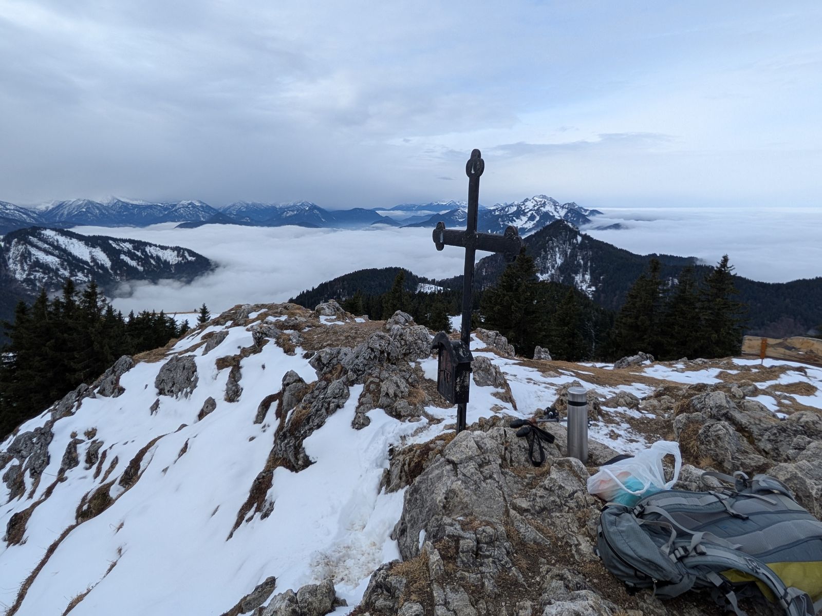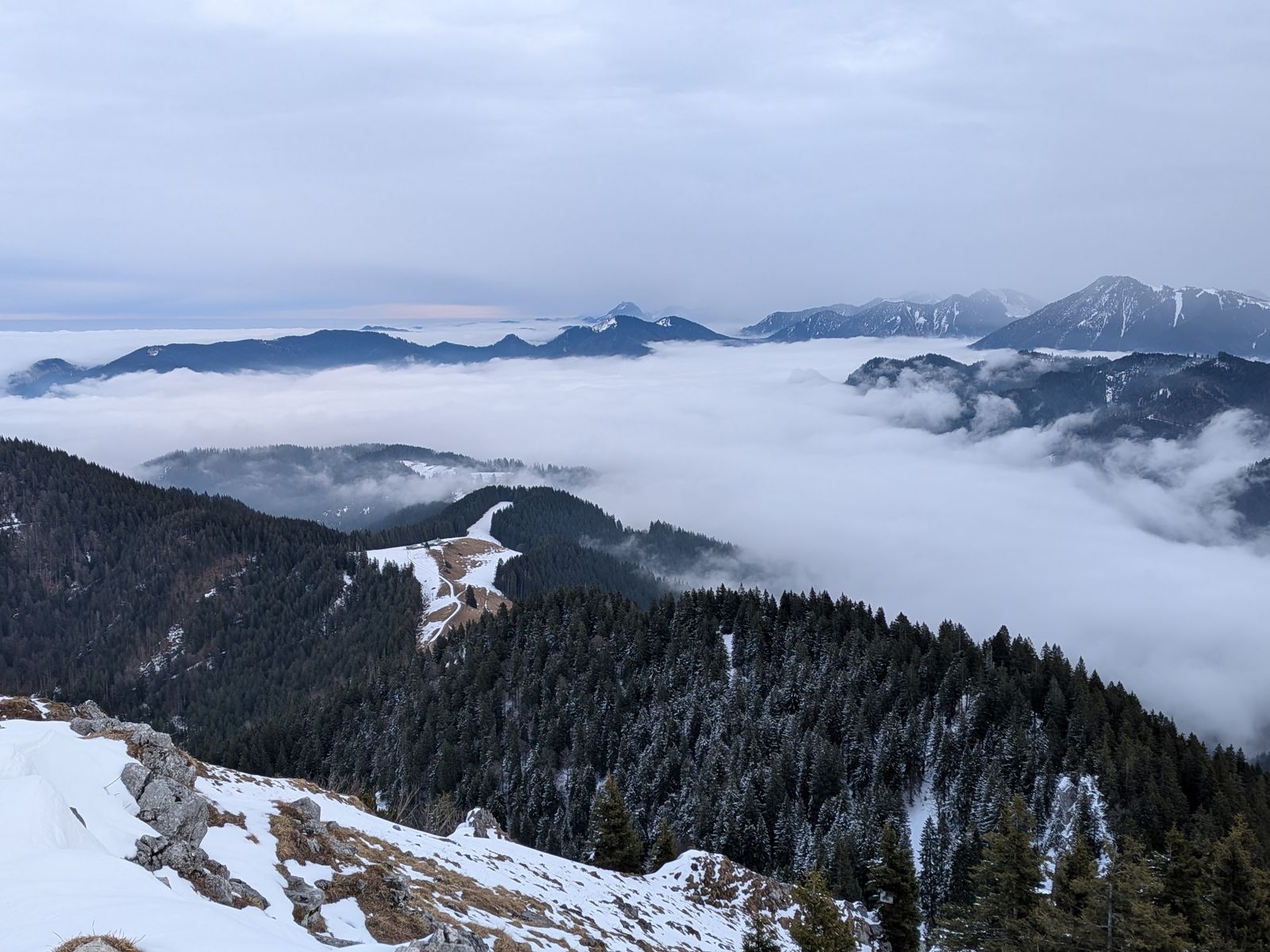 - Bild 7 Gipfelblick nach Osten auf die Aueralm und den inzwischen hoch gezogenen Nebel