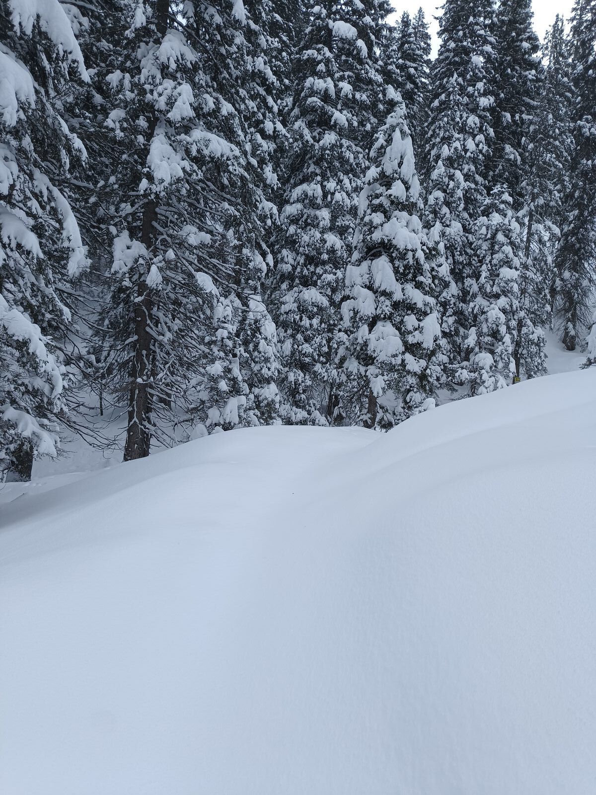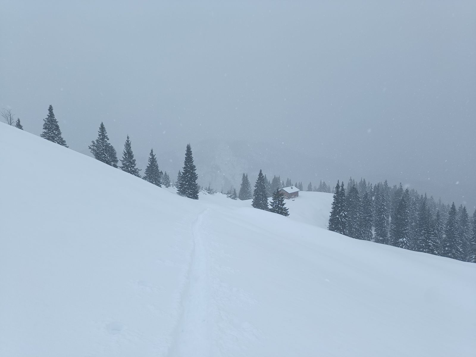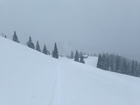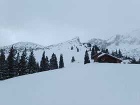 Der Wald ist inzwischen ohne Steinkontakt im Aufstieg und Abfahrt machbar, in der freien Fläche wurde der Schnee dann noch Mal deutlich mehr mit 20-50 cm Neuschnee je nach Windeinfluss, wobei die Tour insgesamt sehr windgeschützt ist. Bei der Stuibenhütte bin ich nur noch ca 200 Meter weiter gegangen, da ich es zeitlich nicht mehr zum Gipfel geschafft hätte und der Schneefall wieder eingesetzt hat.