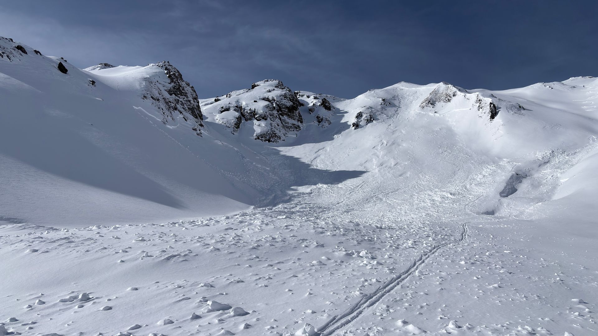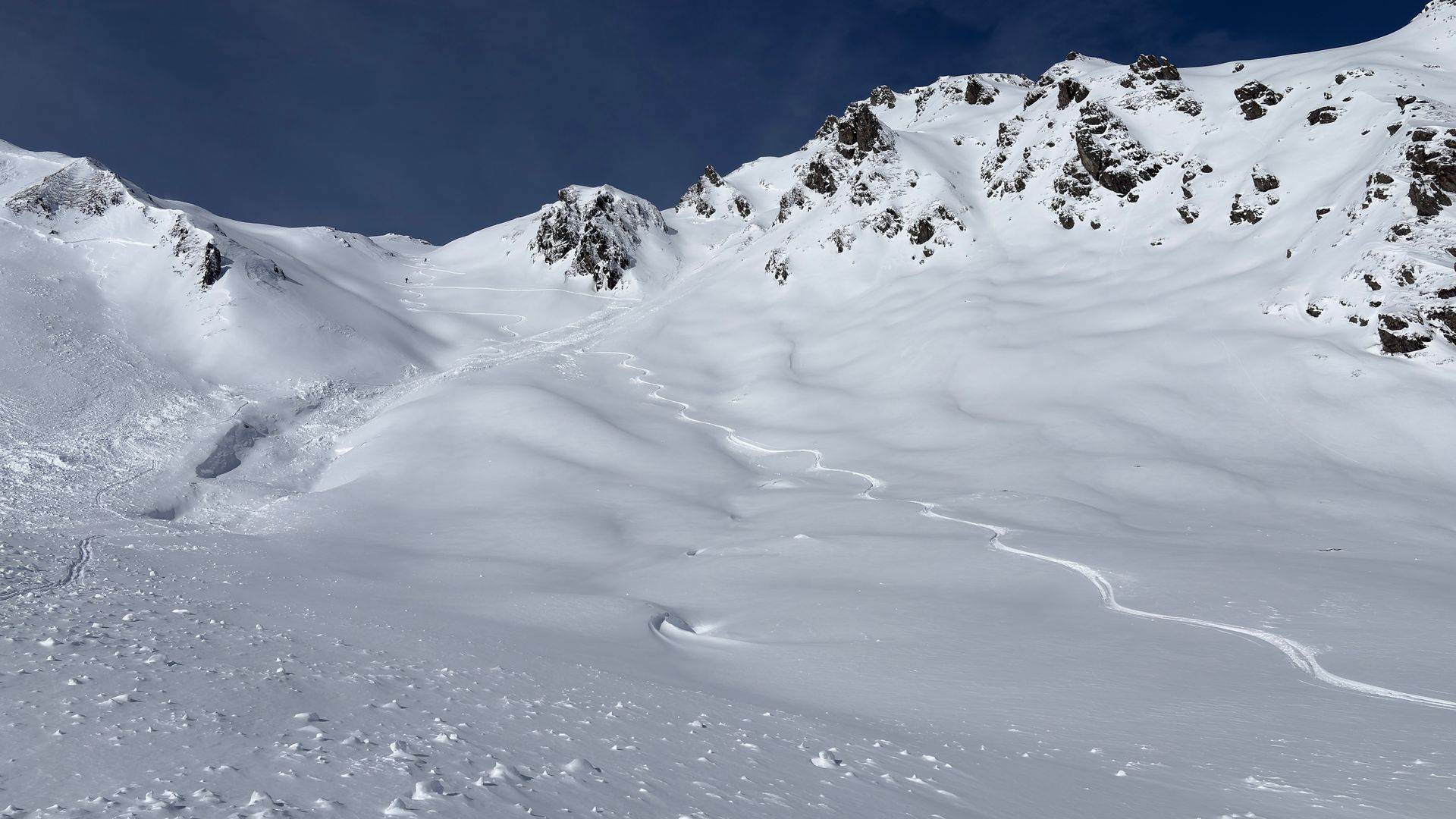 Ab 2100hm konnte man sehr gut sehen, warum heute Lawinenwarnstufe 3 herrschte. Aus den Flanken sind zwei sehr große Schneebrettlawinen abgegangen die sogar die Talmitte mit in Mitleidenschaft gezogen haben. Das Bild ist bei der Abfahrt entstanden...