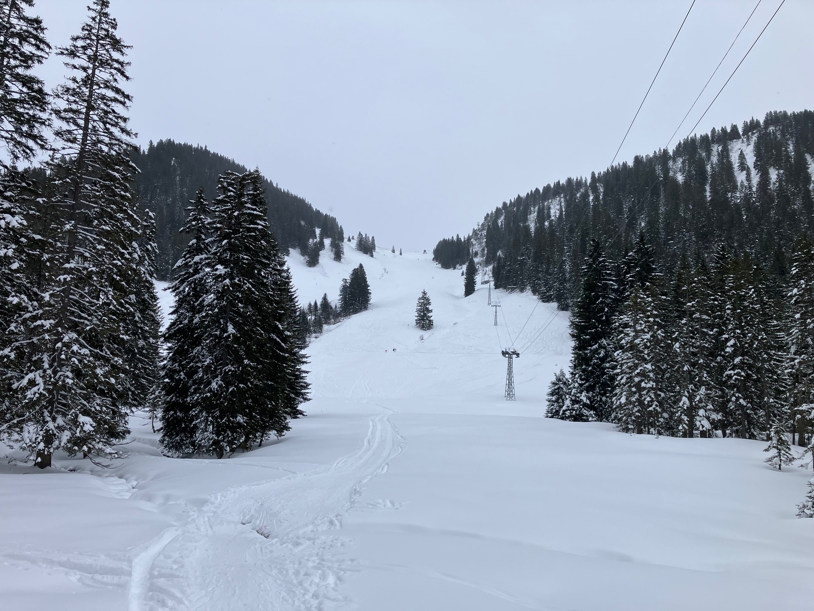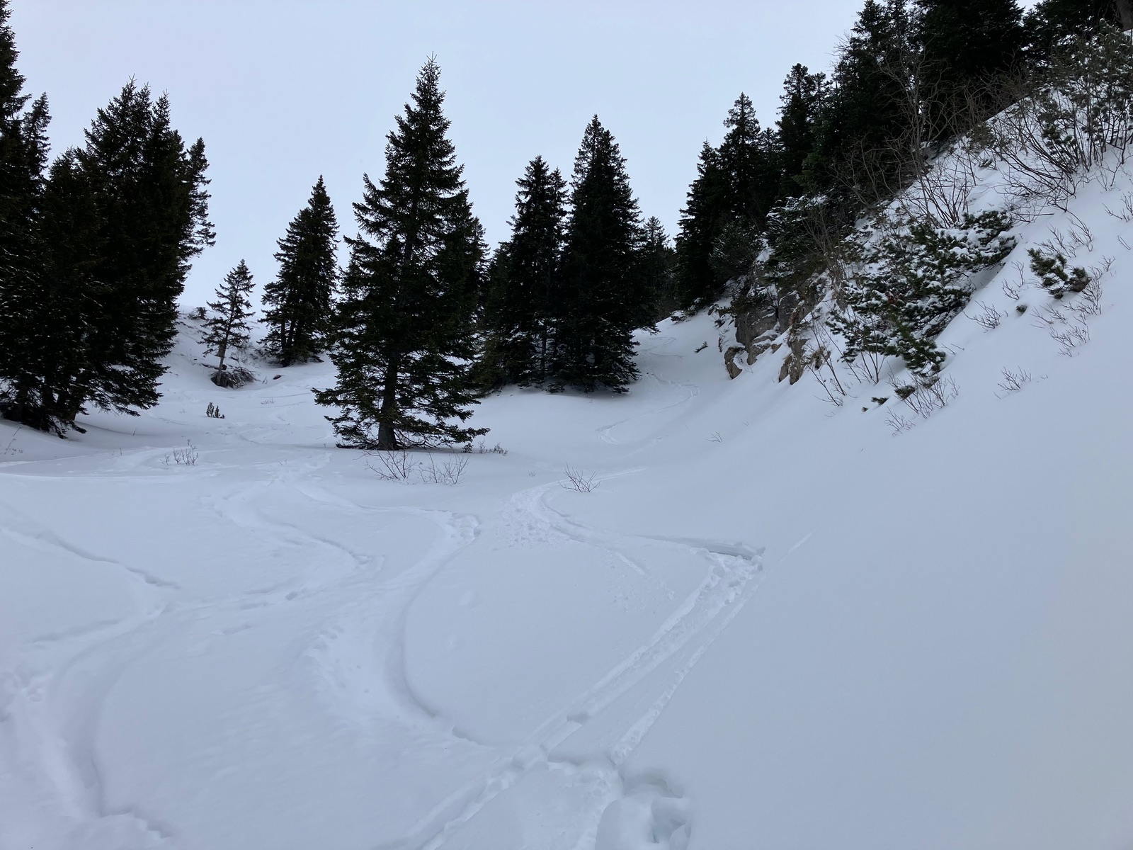 Gute Abfahrtsverhältnisse, soweit windgeschützt und noch nicht zerfahren:
