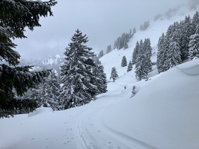 Ja was ist denn mit den Skitourengehern los? Ordentlich Neuschnee, Wetter auch noch machbar und dennoch keine Skispur auf die sonst so beliebte Lacherspitze. So war also gleich von der Bushaltestelle (Busanfahrt vermeidet auch die unverschämten 15 Euro Parkgebühr) kommend zu spuren, wobei der leicht angefeuchtete Schnee mal wieder ordentlich stollte ... So war ich nicht böse, als in der Nähe der Talstation der BW-Seilbahn eine Spur dazu kam - verlief sich aber wieder bzw. war zugeweht (wahrscheinlich von gestern). Eigentlich kenne ich die Gegend, aber ein Mal bei der schlechten Sicht nicht aufgepasst und die letzte Tour in der Gegend auch schon einige Jahre her und prompt bin ich Richtung Seewandköpfl gekommen (und ich hatte mir doch schon gedacht, dass die Lacherspitze früher im Gipfelaufbau etwas aussah). Man kommt aber mit nur ganz geringem Höhen- und Zeitverlust aus der Scharte beim Seewandköpfl wieder auf die normale Aufstiegsroute.