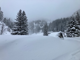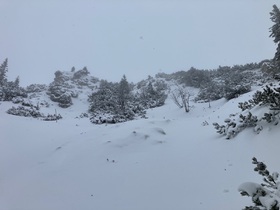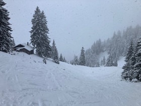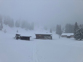 Bei den Wendelstein-Almen starker Schneefall - auf dieser Höhe mal ohne den lästigen Wind weiter oben: