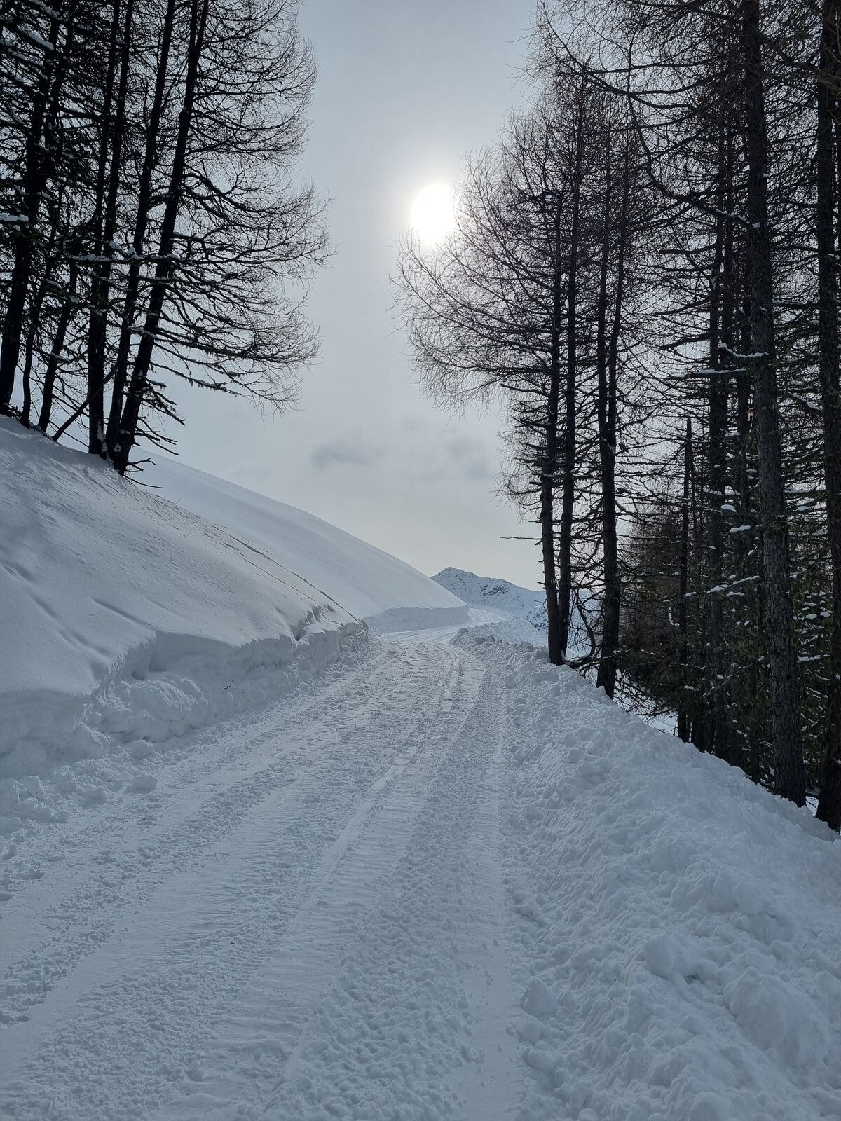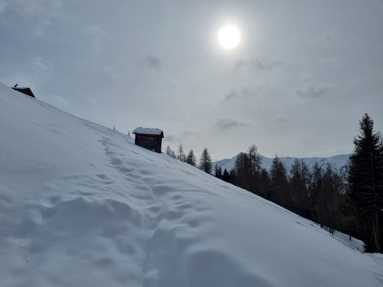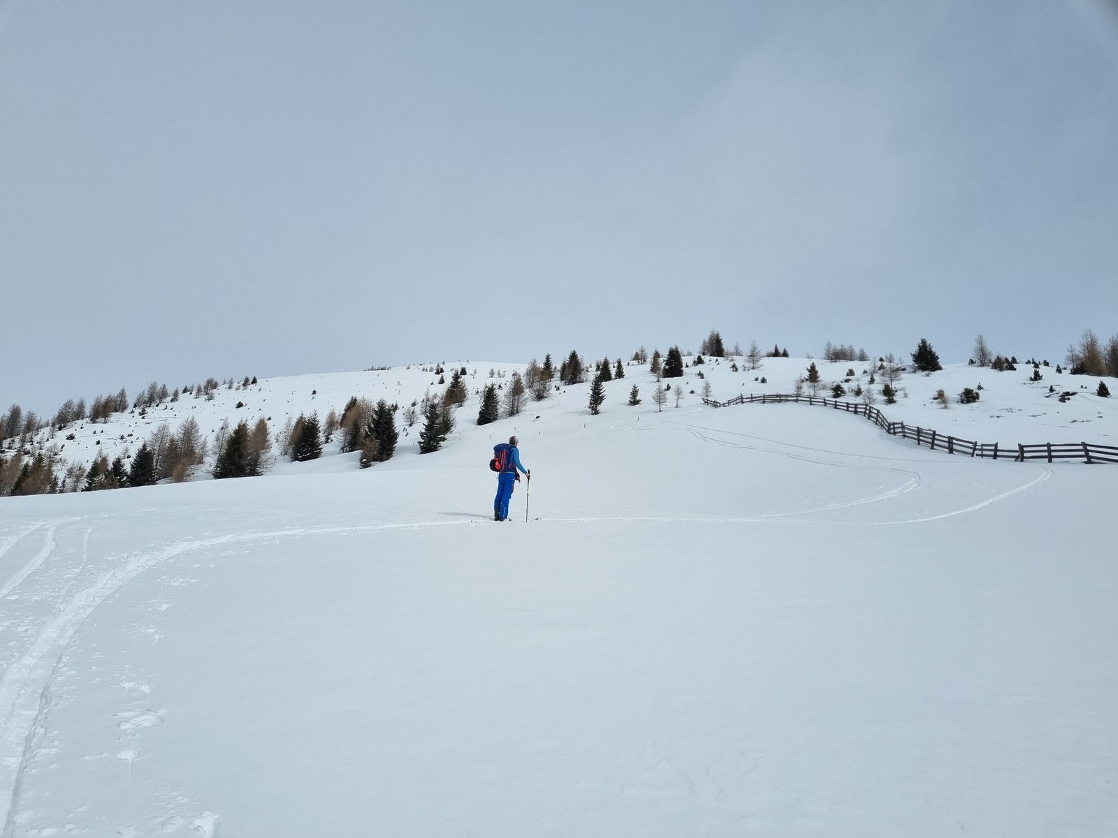 Abfahrt wie Aufstieg. Heute gab die Abfahrt nur wenig her ( Bruchharsch oder schwerer Pappschnee) die Rodelbahn ist bis zum Parkplatz schneebedeckt.