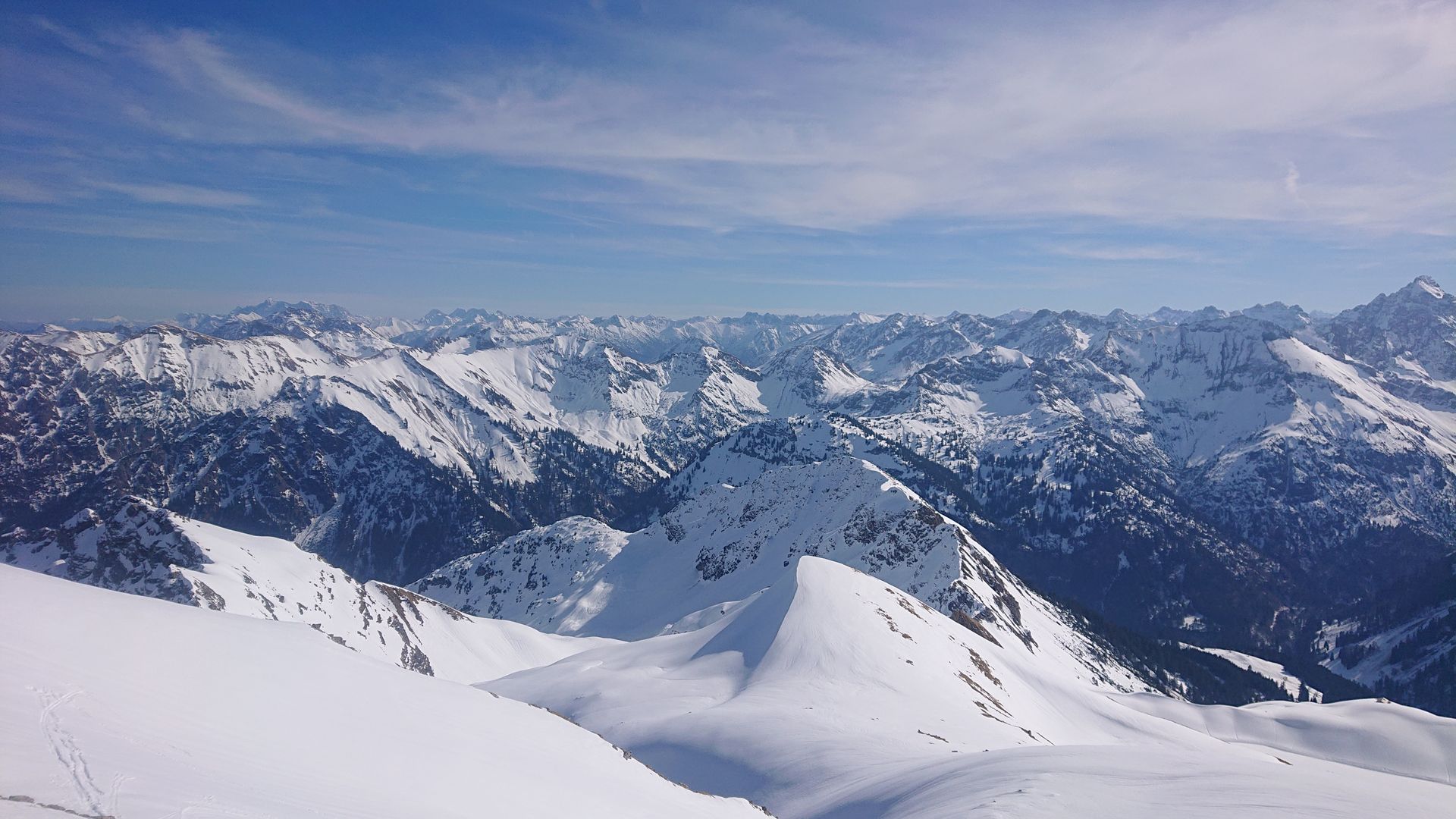 heute bin ich mal wieder auf den großen Daumen gestiegen (größtenteils Süd Expo), da ich keine Lust hatte auf bockharte Verhältnisse im Schatten. Bin von Bad Hindelang mitn Radl zum Giebelhaus (14km knappe 300hm, ab Hinterstein 6km weniger), was problemlos ging (kaum überfrorene Stellen). Hoch bin ich den Fahrweg zum Schwarzenberg gegangen. Bis auf eine ganz kurze Stelle war noch alles mit Schnee bedeckt. Ab der Käseralpe ging es dann kurz vor 9 in die Sonne und es wurde sofort ordentlich warm. Über die übliche Route zum Gipfel war es problemlos möglich ohne Harscheisen aufzusteigen. Morgens waren die tlw. vorhandenen Regenrillen bis vllt 1800-1900m an den etwas härteren Stellen etwas nervig. Aus den Flanken der Laufbichlkirche sind schon einige mehr oder weniger große Lawinen abgegangen, etwas Abstand kann hier nie schaden. Irgendwie hat sich dann im Aufstieg der Kontrast von meinen Handydisplay verstellt und ich konnte einige Zeit keine Bilder machen. Bin dann ca. 10:30 abgefahren zum Engeratsgundsee in tollem Firn die 400hm. Bis dorthin waren kaum Regenrillen im Schnee. Am See dann erneut aufgefellt und noch zweimal die guten 320hm auf den Kleinen Daumen angehängt. Auch hier herrliche Firnverhältnisse bei den Abfahrten. Um 12:30 gings dann vollends runter, bis 1700m war alles noch top zu fahren, unter 1600m wars schon recht weich. Von der Käseralpe hab ich mich mehr schlecht als recht direkt runter ins Obertal manövriert, weil der Kollege aufm Kleinen Daumen meinte das ginge noch ganz gut. Über den Schwarzenberg wäre hier jedoch besser gewesen. naja danach ischd man immer schlauer ![]()