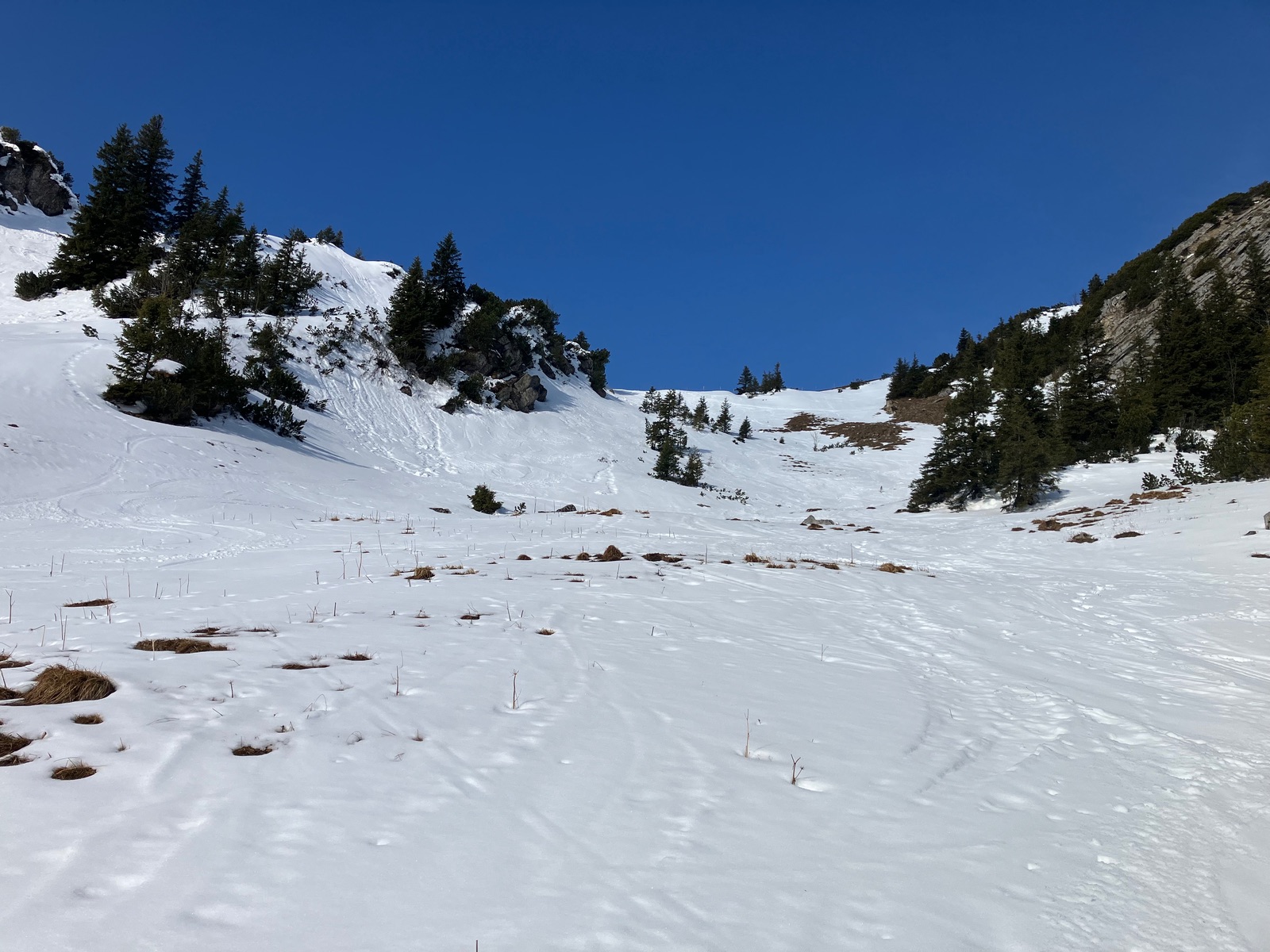 Blick aus der Rinne auf die bisherige Abfahrt - hätte gerne etwas aufgefirnter sein können: