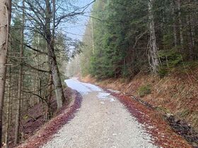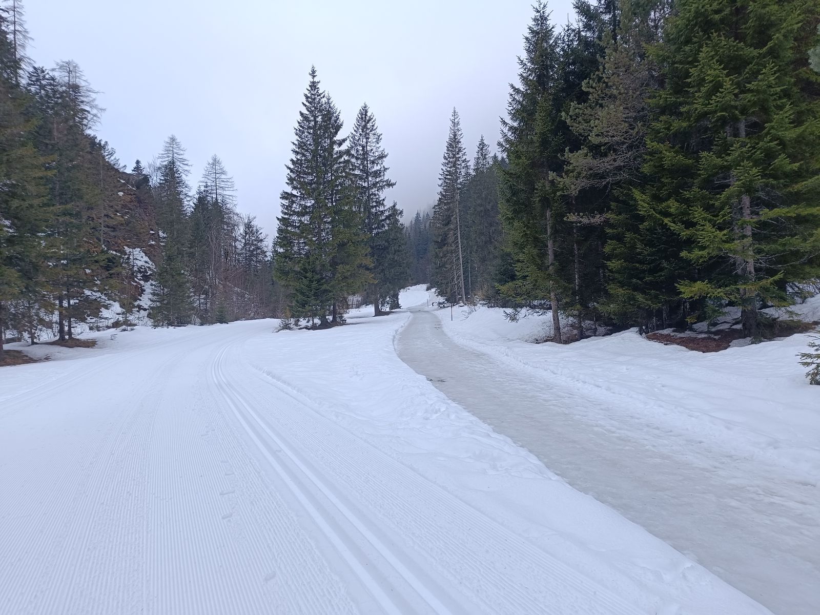 Anstieg und Abfahrt gingen heute noch trotz einiger kurzer aperer Stellen mit nur einem Abschnaller. In den nächsten Tagen ist im Mittelteil der Forststraße - dort, wo diese am Südhang verläuft - aber mit einer durchgehenden Tragepassage von 10-15 Minuten zu rechnen.
