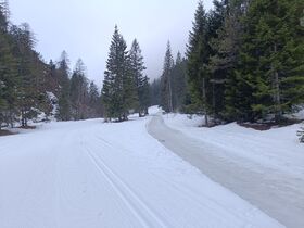 1: Dank Loipe und vereister Forststraße geht es vom unten weg mit Skiern