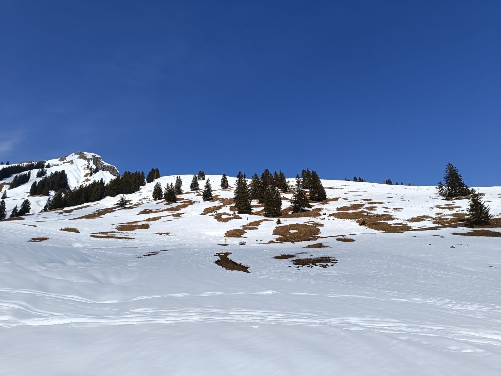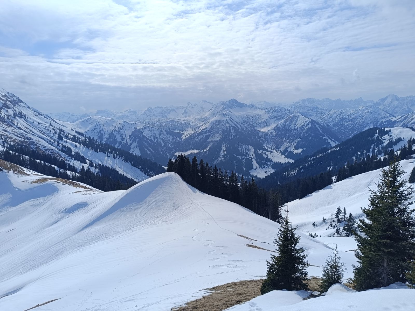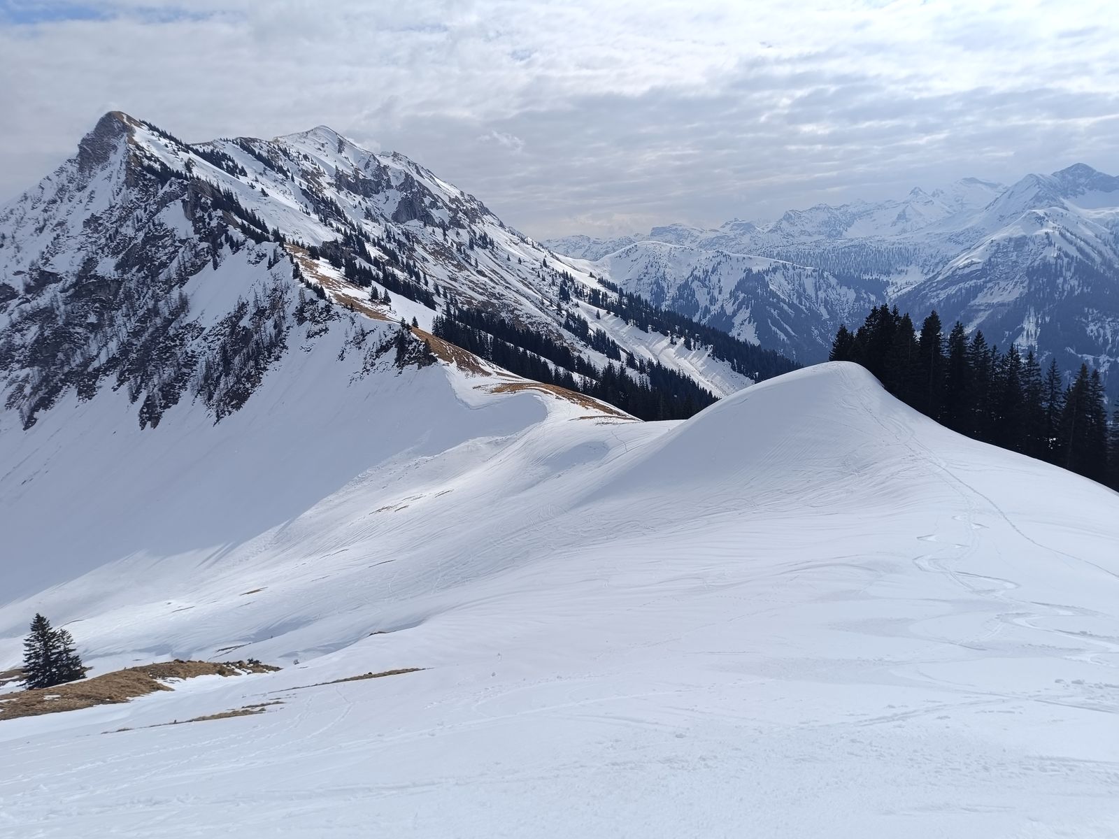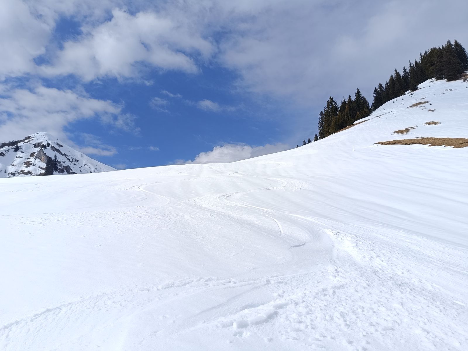 Anschließend bin ich zum Gröbner Hals, wo die Schneedecke deutlich kompakter ist und der Firn länger hält. Zwischen 12 und 14 Uhr habe ich am Gipfelhang mehrere schöne Abfahrten auf diversen Feinvarianten gehabt. Genießen durfte ich das Ganze heute allein, weil erst bei meiner letzten Abfahrt zwei Kollegen im Aufstieg waren. Ab 14 Uhr kommen die Hänge übrigens wieder in den Schatten und dann ist Schluss mit Firn.