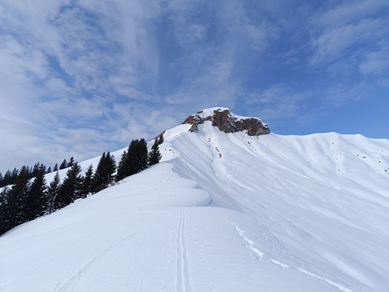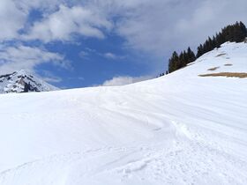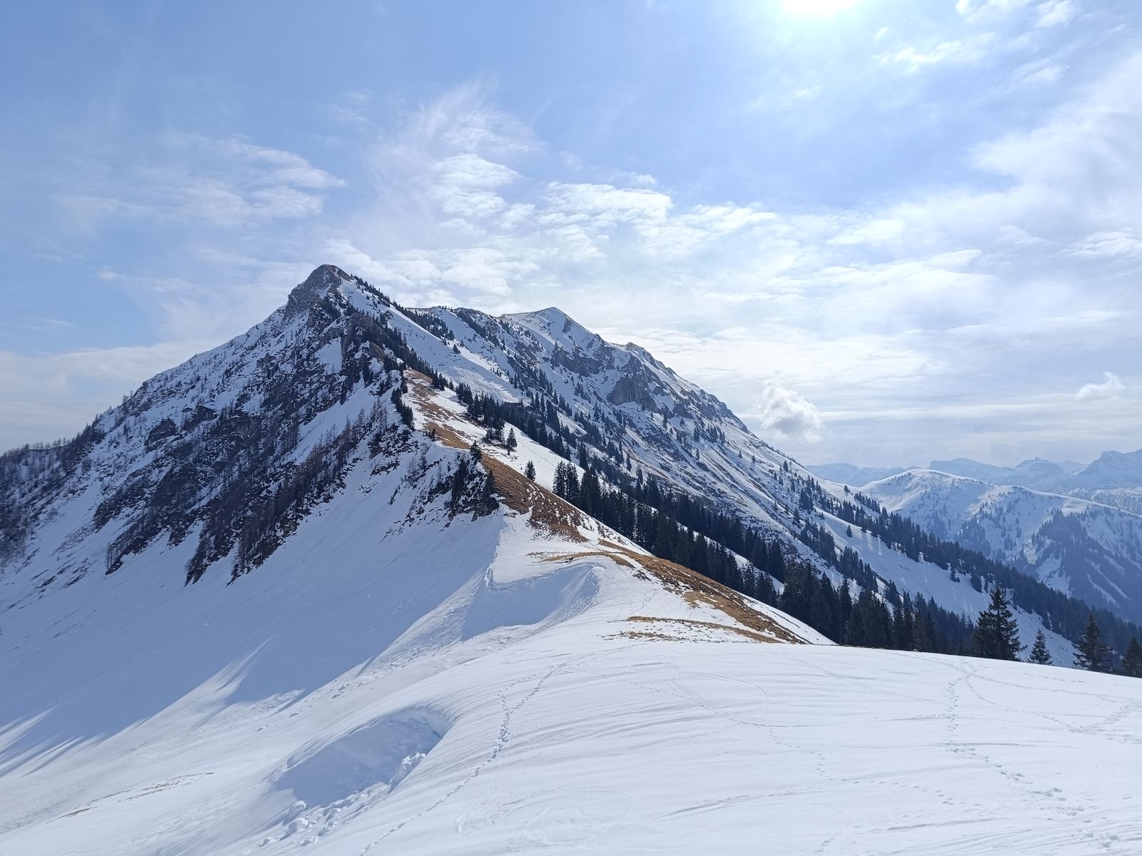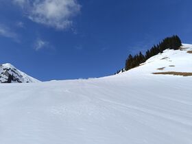 Als ich beim Aufstieg zu den freien Hängen gekommen bin, war es dort noch recht hart und so habe ich spontan entschieden, zunächst mal die Südhänge Richtung Rether Kopf hochzusteigen, weil es dort zuerst auffirnen würde (siehe Bild). Zum Gipfel bin ich nicht (zu lawinös bzw. schlechter Schnee in den Nordosthängen). Im Südhang gab es heute ein ganz minimales Firnfenster von 11.00-11.10 Uhr, das ich glücklicherweise erwischt habe. Im unteren Teil war die Schneedecke dann schon am Versulzen. Das hat mich natürlich hinsichtlich der Richtigkeit der Tourenwahl bestätigt.