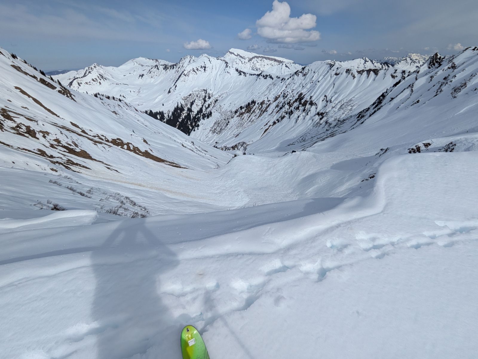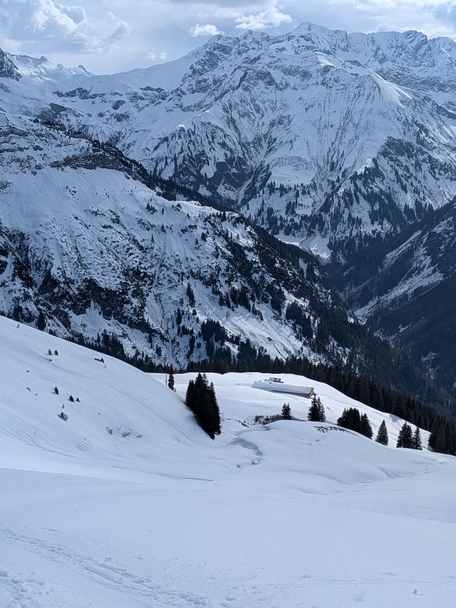 Bezüglich der möglichen Nordabfahrt vom Häfnerjoch nach Schoppernau kann ich mir nicht vorstellen, dass das Spaß macht. Der gesamt Talkessel unterhalb des Jochs ist von großen Lawinen aus den umliegenden Flanken überdeckt. Außerdem dürfte die Tragestrecke am Ende dieser Variante deutlich länger sein.
