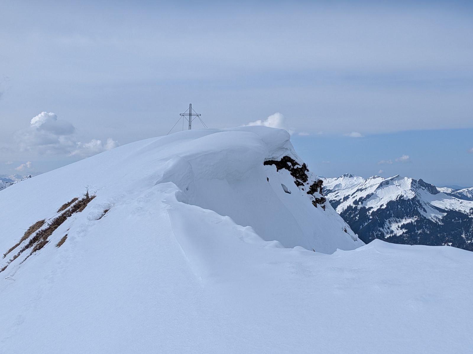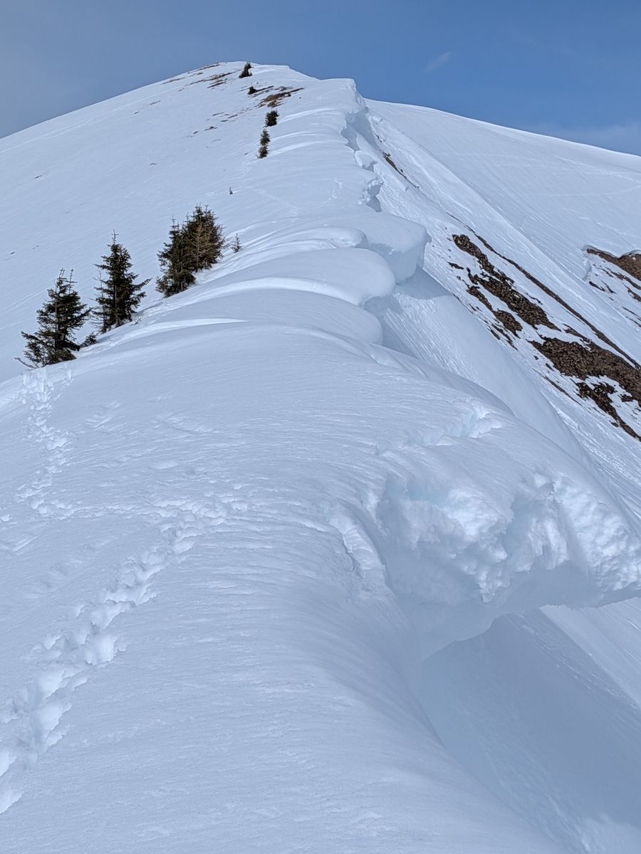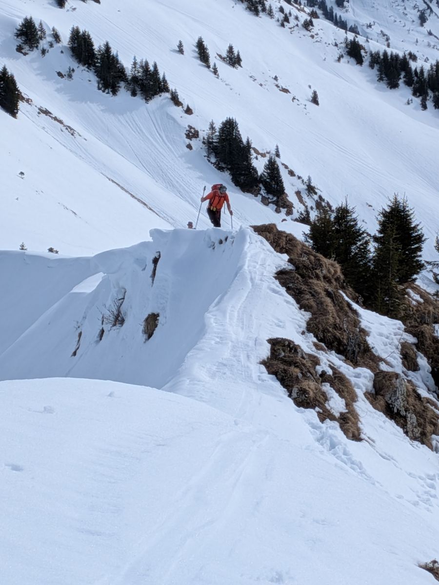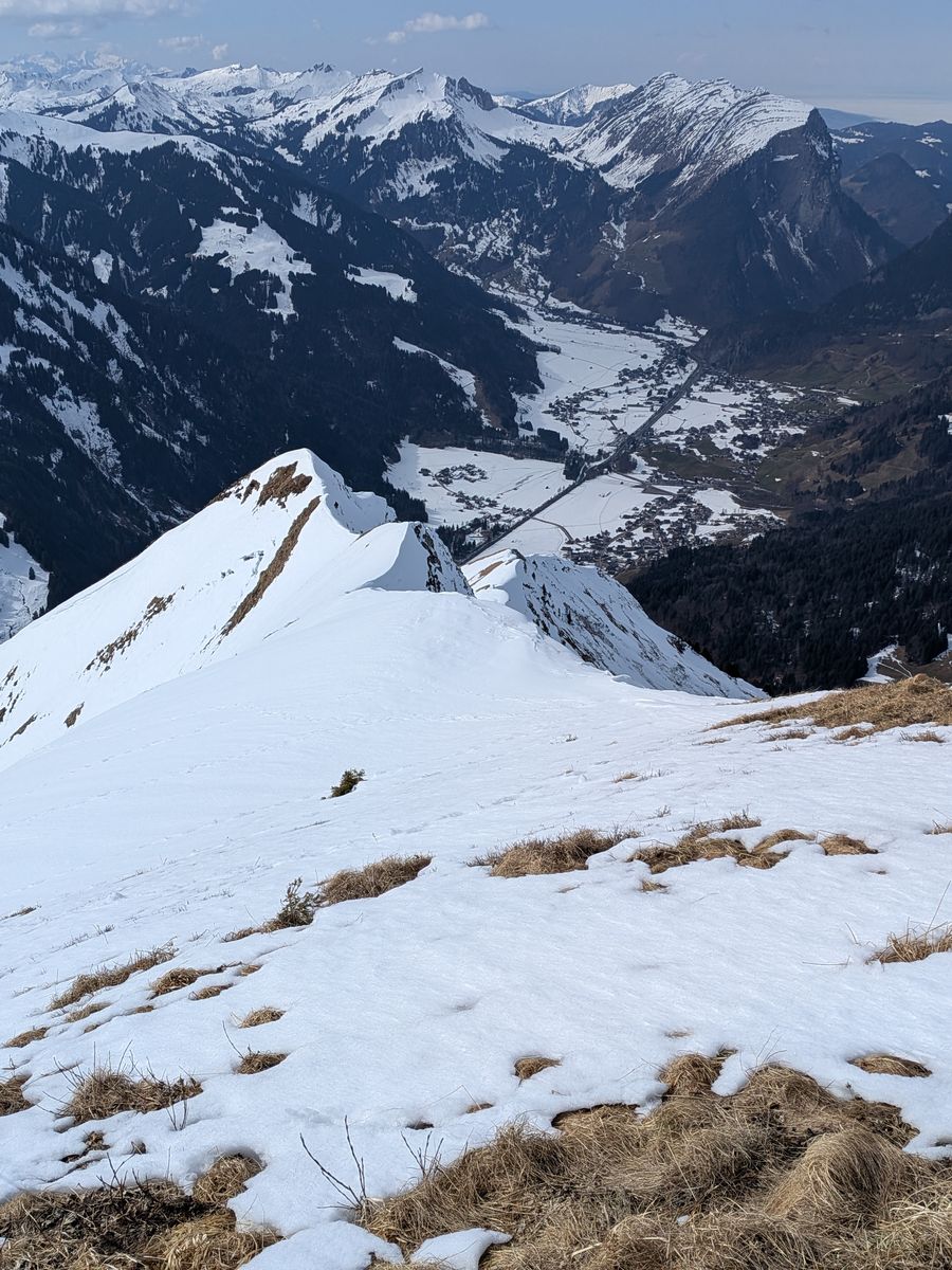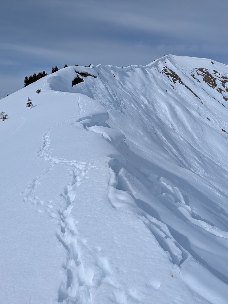 Auf den Wiesen bis zum Waldrand noch dick Schnee, dann auf der Forststraße durch den Wald ca. 10 Minuten Ski tragen (zwischen 1070m und 1130m), anschließend noch zwei oder drei kürzere apere Stücke, über die man auch mit Fellen laufen kann, ab 1170m Höhe durchgehend Schnee. Über die Forststraße zur Vorderüntschenalpe (1759m) und weiter über steile Südhänge zum Häfnerjoch (1979m) und meist auf, ein Stück lang auch in der obersten Südflanke, dem langen Gratrücken zum Gipfel der Üntschenspitze. Eine etwa zehn Meter lange Stelle am Grat ist sehr schmal und aper und kann auch nicht in der Flanke umgangen werden. Den Grat entlang viele sehr große Wechten!