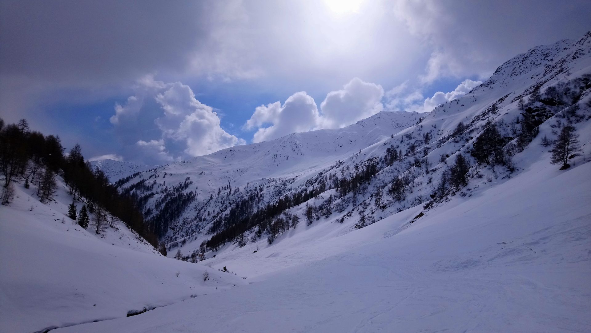 Schnee war noch ausreichend vorhanden, wenn auch die Südhänge schon stellenweise ausapern. Über Nacht hatte es ein paar Zentimeter Neuschnee gegeben. Das zusammen mit einem tragenden Harschdeckel, warmen Temperaturen und - bis auf wenige kurze Schneeschauer - fast durchgehend Sonnenschein gab eine traumhafte Abfahrt (zumindest im oberen Abschnitt). Kurz vor der Bachquerung wurde es dann zunehmend sumpfig, aber noch sehr schön zu fahren. Auf dem letzten Stück über den Almweg runter dann schon sehr nass, aber noch ok.