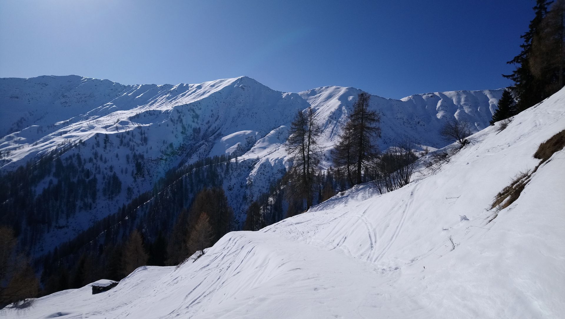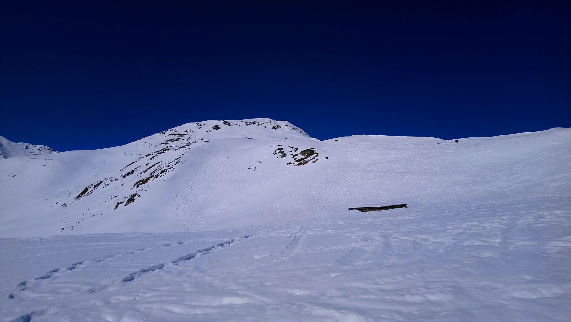 Die Schneequalität wechselte bei der Abfahrt zwischen beginenndem Firn, Sumpf und im Schatten sogar teilweise noch hart gefroren. Die Tour ist auch schon stark verspurt, im weichen Schnee haben die Spuren aber nicht so gestört, so dass die Abfahrt doch sehr schön war.
