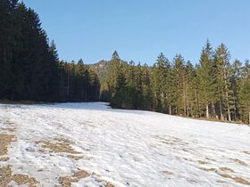 Abfahrt: In den direkten Nordabfahrten liegen überall Lawinenboller. Die Abfahrtsrinne zur Bärenbadalm war noch gefroren, während wir ganz oben teils schon fast durchgebrochen sind. Timing ist also schwierig. Wir haben es mit Abfahrt um halb eins wohl recht gut erwischt.![]()