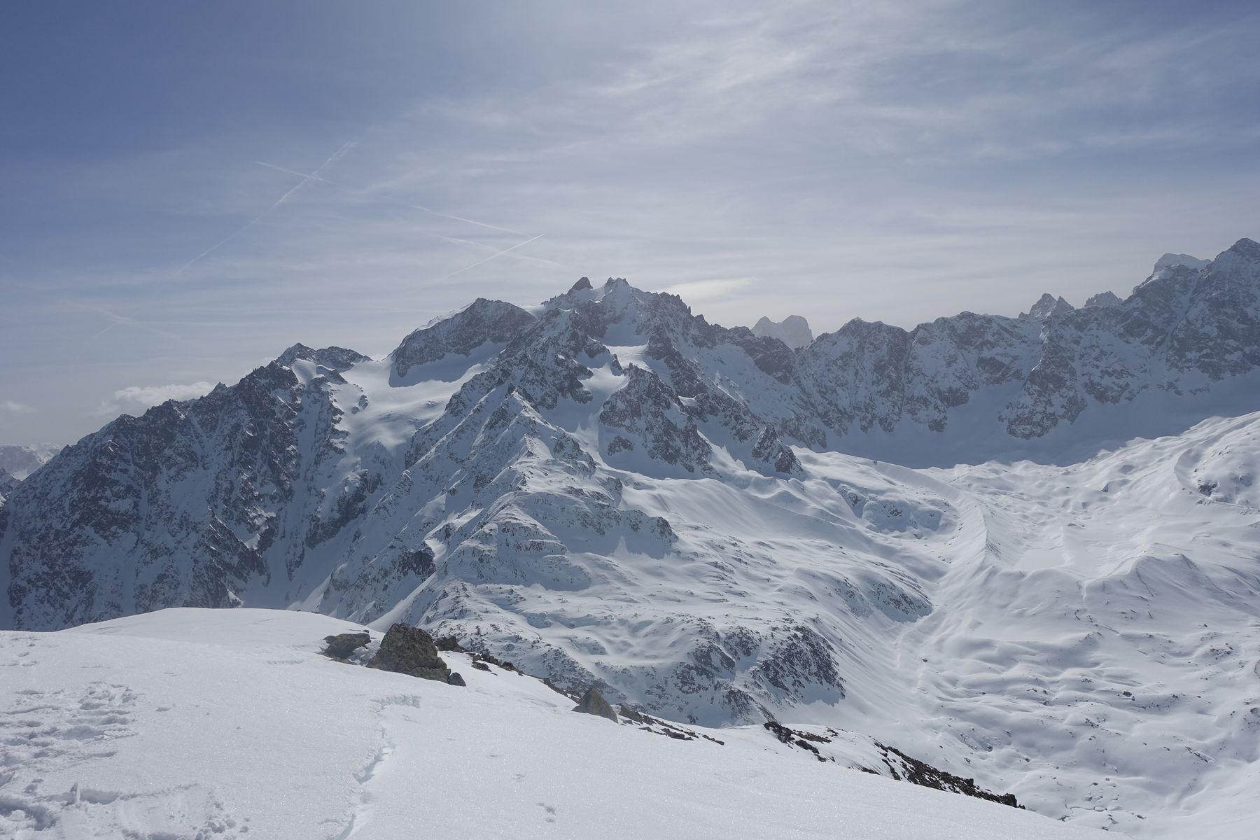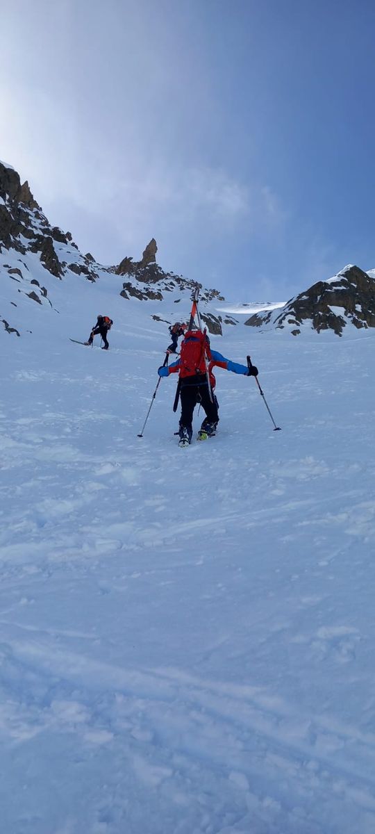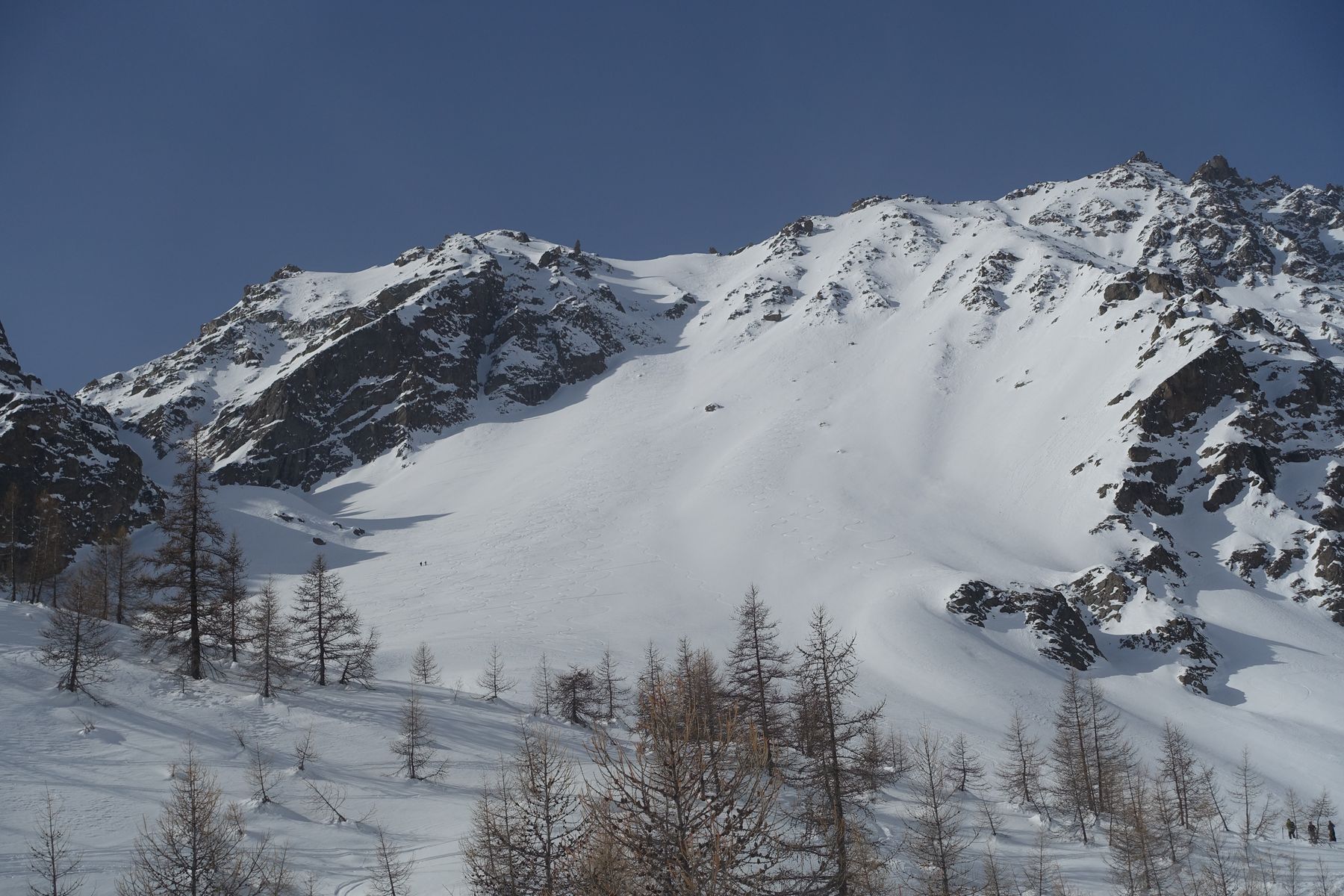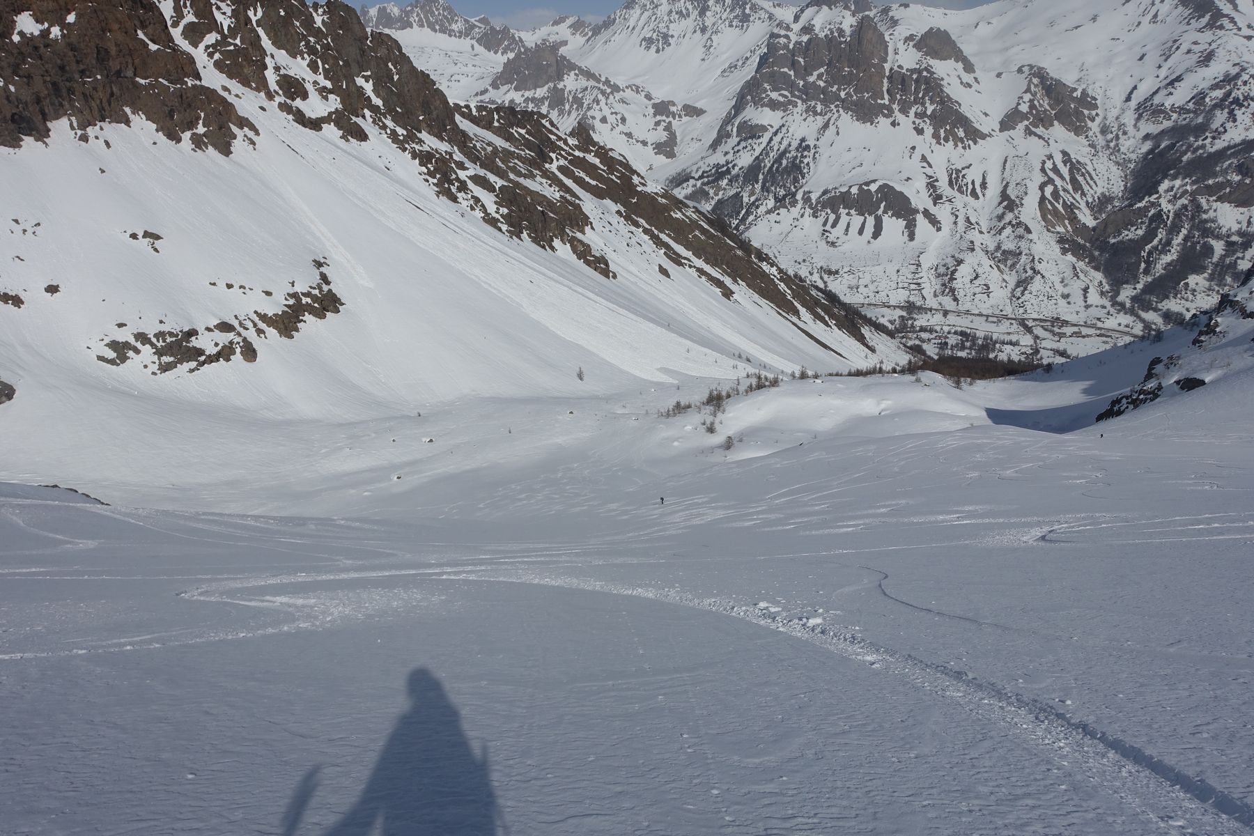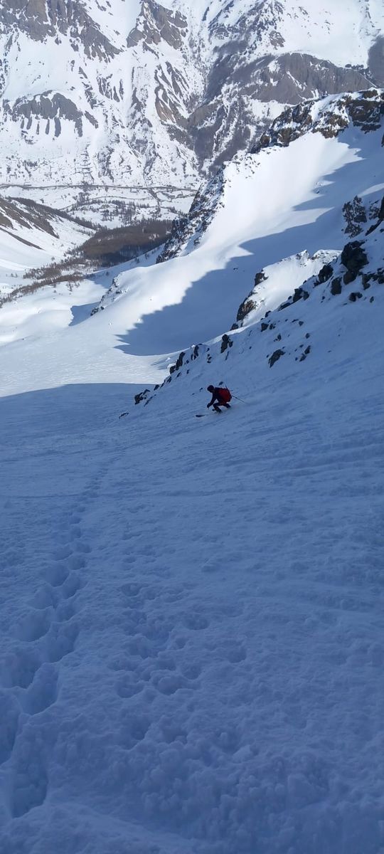 Steiler Klassiker von Monetier-les-Bains, und zwar im "Vallon du Fontenil", wo auch die Skitour zu "Les Jumelles" verläuft. Vom Ausgangspunkt steigt man zuerst ans Ende der Wald auf, danach nach links in einen breiten Hang, der immer steiler wird, bis man sich in einem 40° geneigten Couloir befindet. Die letzten 200 Hohemeter sind besser zu Fuss zu gehen. Die Grat ist jedoch breit und bequem, und der Gipfel dann einfach zu erreichen. Die Abfahrt war anspruchsvoll aber machte heute wirklich Spaß! Bei der Nord-Ost Exposition ist der Schnee kalt geblieben, und wir hatten schönen windgepressten Pulverschnee.