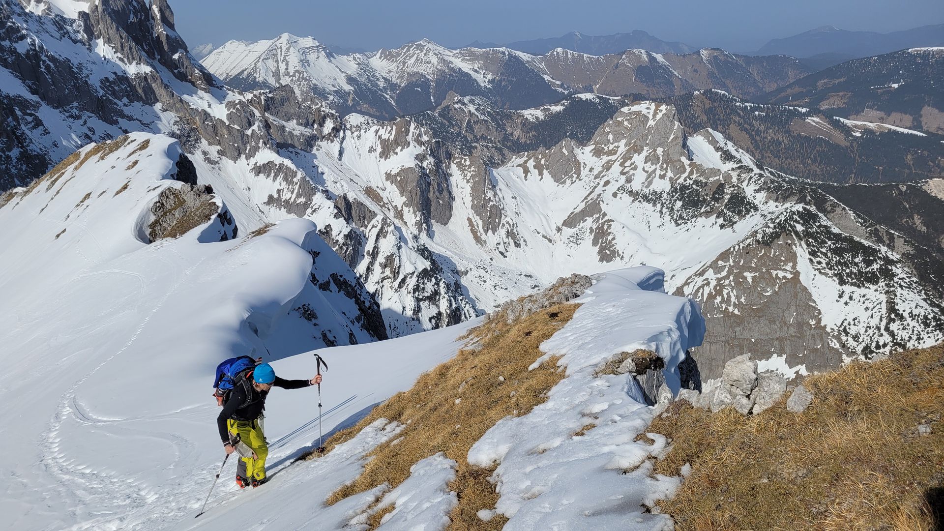 Die nächsten 11 km auf Ski weiter. Im Kar waren einige Lawinenabgänge von den Vortagen zu sehen. Zum Grat steilt es sich nochmal auf - sichere Verhältnisse erforderlich. Wir brauchten keine Harscheisen. Die letzten Meter zum Gipfel zu Fuß auf steilem Wiesenhang.