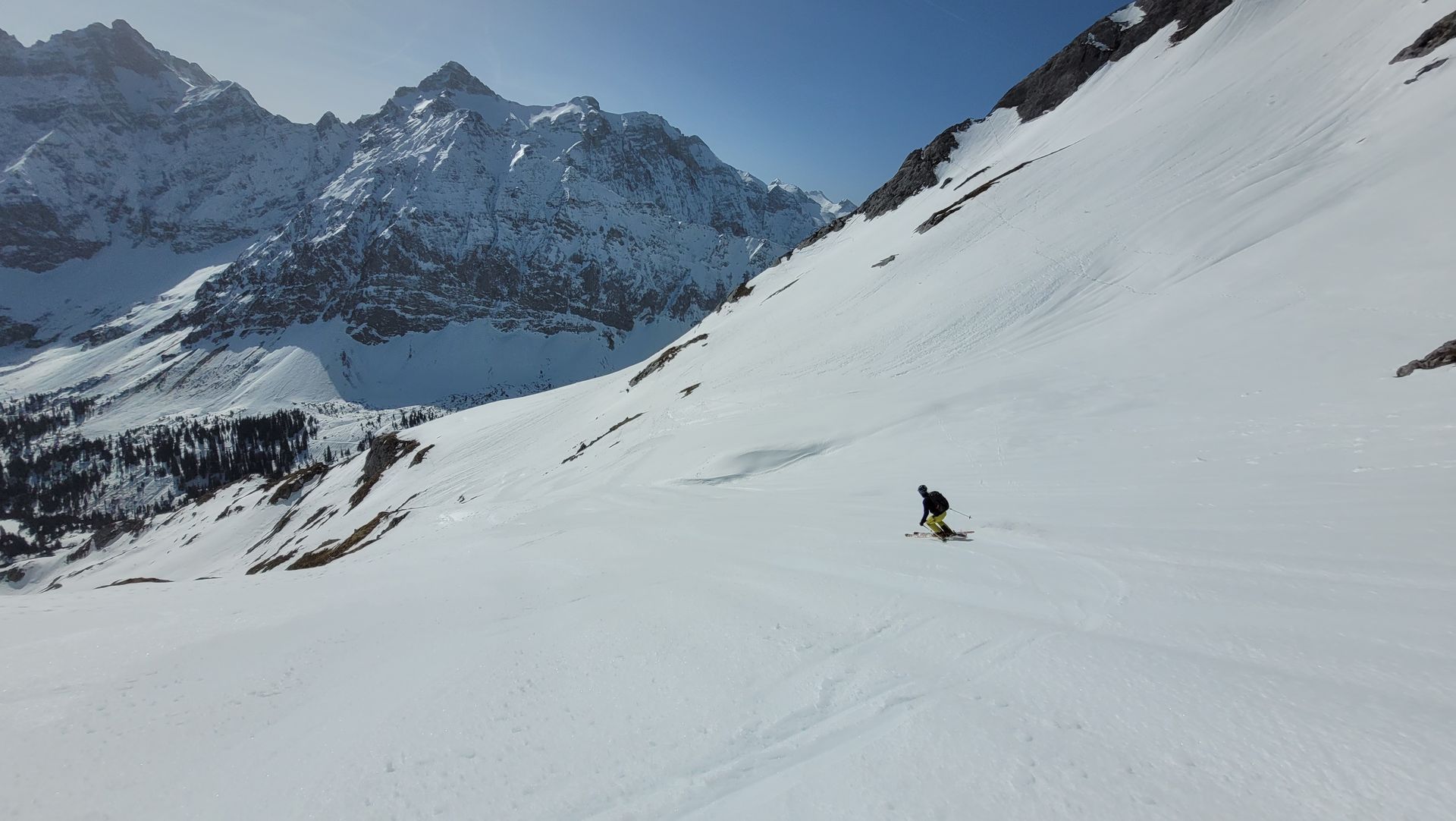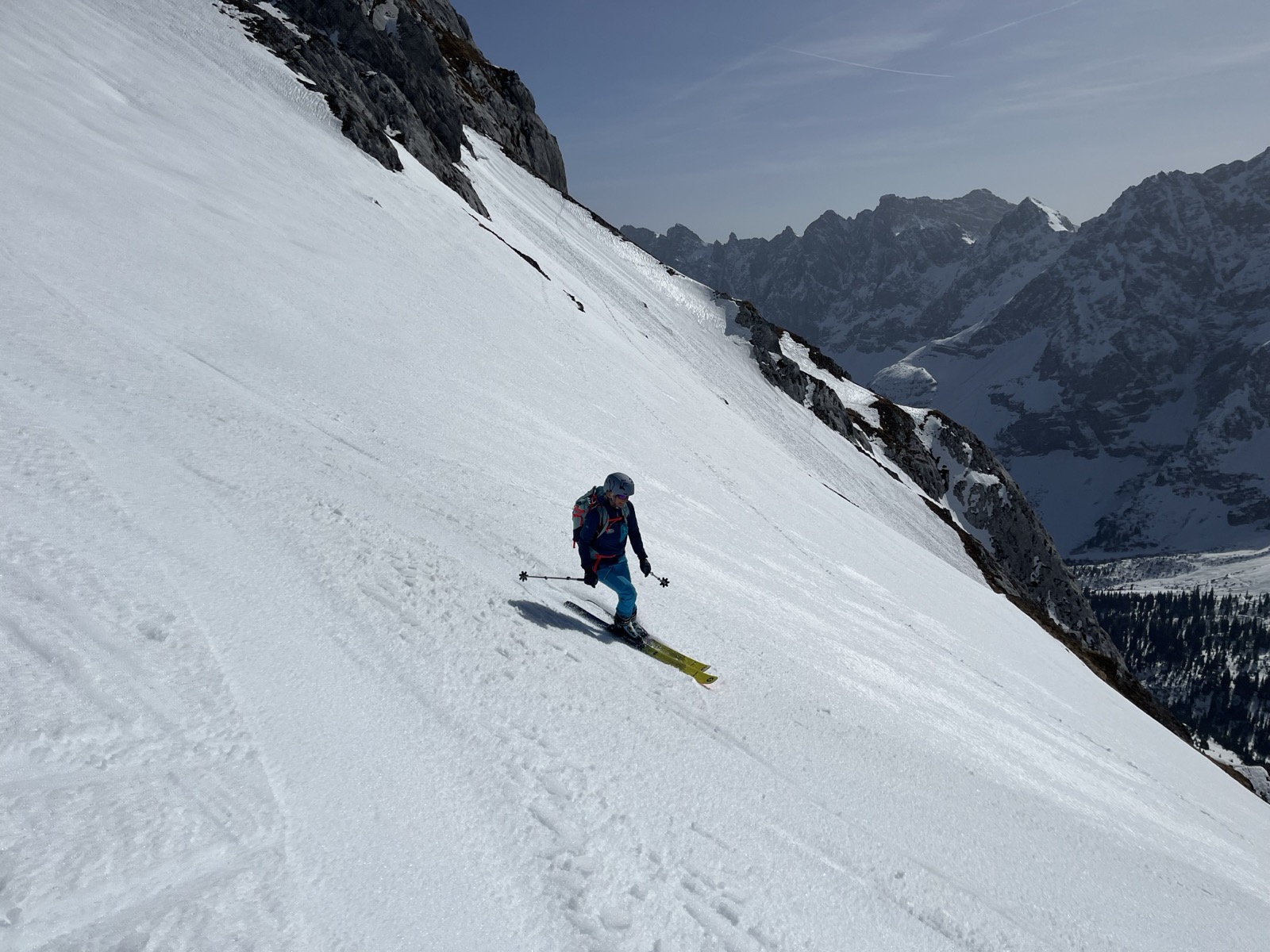 Abfahrt im Firn. Ein herrliches Vergnügen. Juchee. Stades Karwendelpanorama.