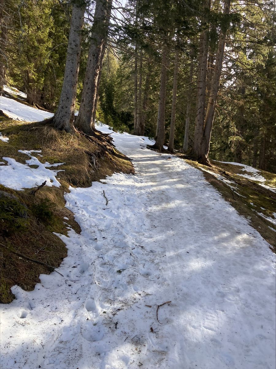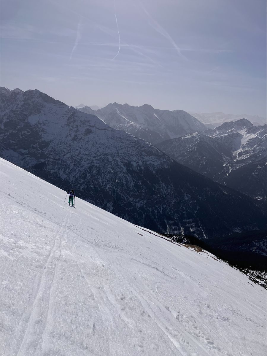 Die Forststraße ist grundsätzlich fahrbar – durchgehend allerdings nur für Menschen mit guter Skibelags-Toleranz. Der Rest schnallt gefühlt alle paar Minuten an und wieder ab. Die letzten rund 350 Hm sind dann endgültig wieder Tragepassage.