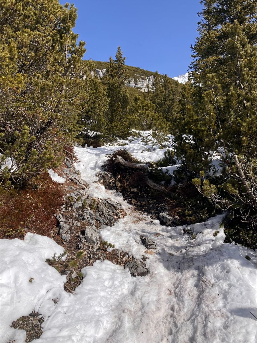 Ab der Pleisenhütte beginnt der kreativere Teil der Tour. Durch die Latschen geht es über den Sommerweg. Mit etwas Geschick kommt man mit 1-2 kurzen Abschnallern durch, schön ist allerdings etwas anderes.