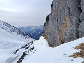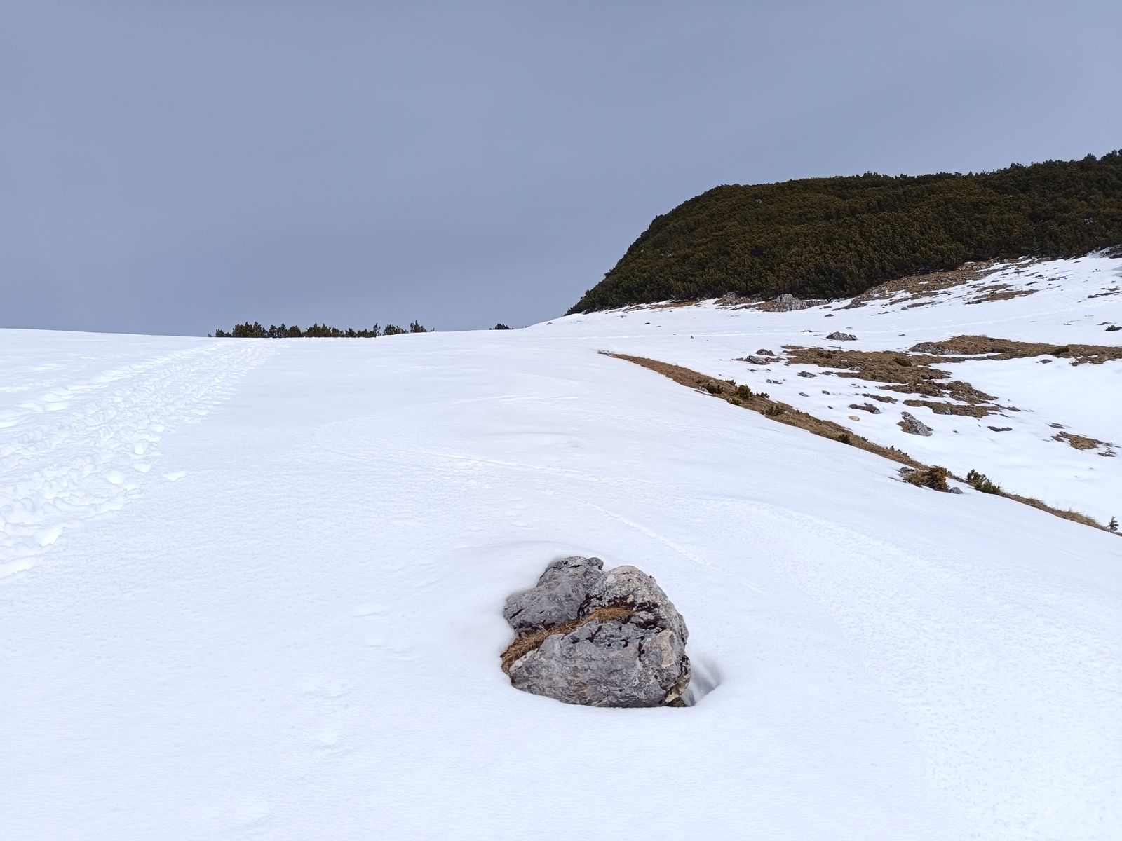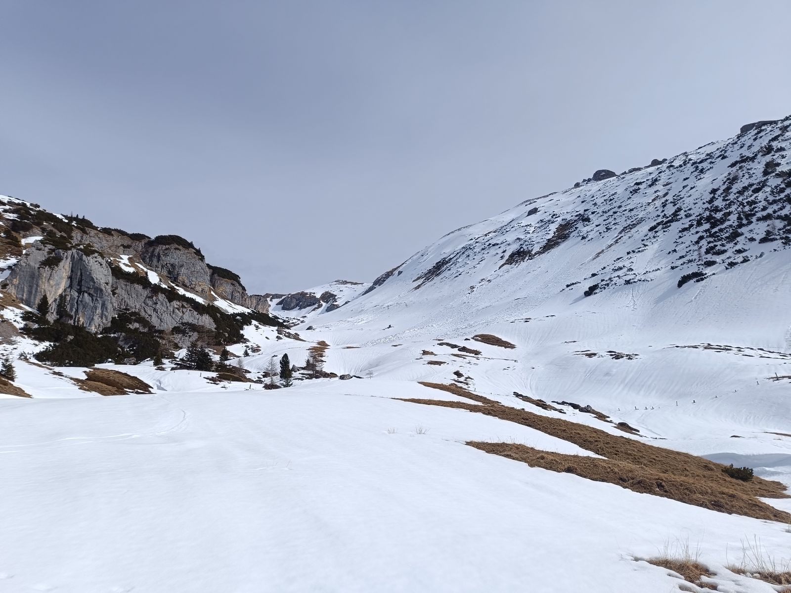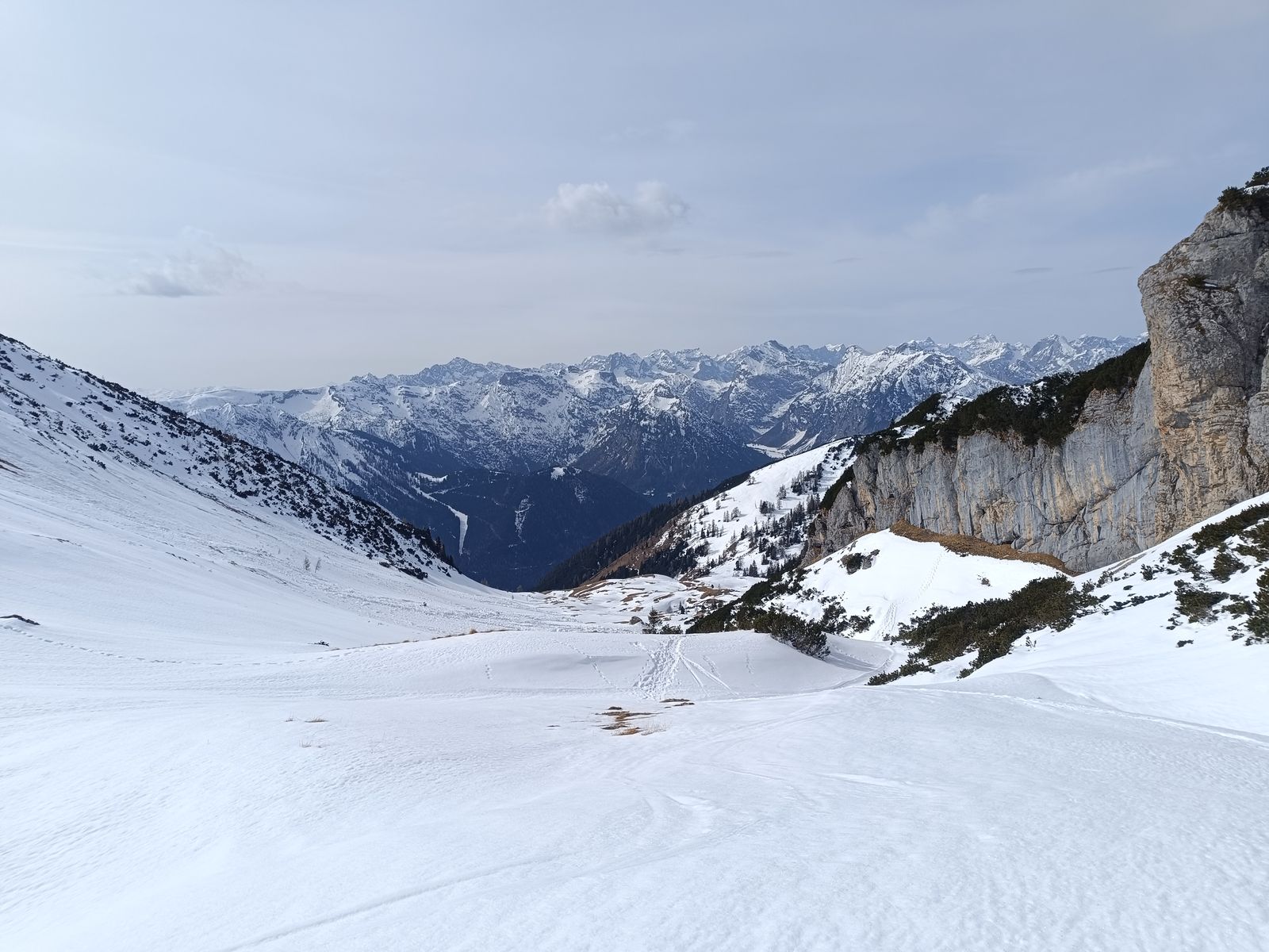 Danke an Jonas für seinen Bericht von gestern. Ich wollte heute eh zum Kotalmjoch und dank des Berichts wusste ich, dass ein Start beim Achenseehof noch halbwegs sinnvoll ist: 15 bis 20 Minuten Skitragen und dann (mit einer längeren Tragepassage beim Kotalm-Niederleger) auf Skiern hoch (etliche kurze apere Stellen bis 1480m, genau wie von Jonas beschrieben). Ich denke, dass es ab morgen aber sinnvoller sein dürfte, mit Bergschuhen von Schwarzenau aus zu starten und die Skiausrüstung vielleicht ab 1400 Metern zu benutzen.
