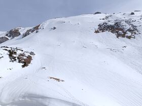 Daher ging es auf dem gleichen Weg zurück, also von der Dalfaz Alm zum Steinernen Törl. In die Mulde sind (schon vor zwei Wochen - siehe meinen Bericht vom 27. Februar) Lawinen abgegangen, aber der größte Hang ist noch nicht entladen. In der Abfahrt schießt man an der gefährdeten Stelle (Geländefalle unten) in fünf Sekunden durch, aber im Aufstieg wollte ich da nicht unbedingt gehen. Deswegen bin ich am Gegenhang direkt ins Steinerne Törl - das ist sicherer. Den anschließenden Bruchharsch-Hang auf der Nordseite des Törls bin ich einfach quer rübergefahren bis ich wieder Firn erreicht habe. Nun könnte man gleich zum Kotalm-Mittelleger abfahren, schöner ist es aber, von der Mulde unterm Törl durch eine deutliche sichtbare Latschengasse linkerhand nochmal zum Kotalmjoch aufzusteigen. Hier um 14 Uhr wiederum Idealfirn, also bin ich gleich... - nein, nicht nochmal hoch. Es war dann doch genug. Dank der etwas kühleren Temperaturen und leichten Windes hat sich der Firn heute länger als sonst in den Südhängen halten können.