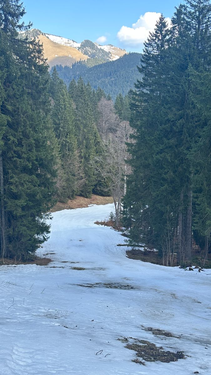 Felle wieder drauf, nun auf der modifizierten Grünseeroute hinauf zum Roßkopf. Modifiziert? Also, für den Pistenbetrieb ist die Abfahrt gesperrt, denn nach dem ersten Waldgürtel (dort, wo die freien Wiesen beginnen) ist ein größeres Stück aper. Allerdings lässt sich das mit Skiern gut umgehen, indem man links hinauf Richtung Stolzenberg geht, 2x kleine Bäche überquert und oben auf die lange Querung stößt. Auf dieser entlang bis zum "Manuel-Neuer-Gedächtnishang", 2x muss gaaaanz kurz abgeschnallt werden.
