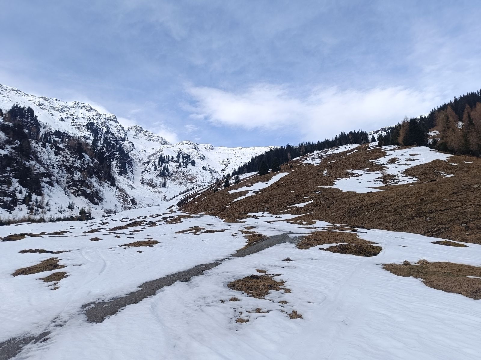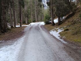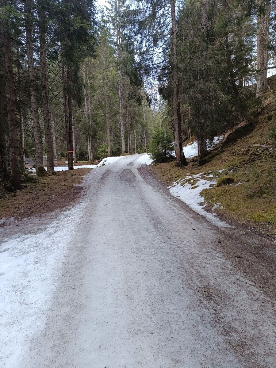 Die Forststraße ist bis zur Greitalm eine einzige Eisbahn mit kleineren Lücken. Mit ein bisserl "Robustheit", wie Jonas das immer so schön formuliert, muss man aber nur einmal abschnallen.