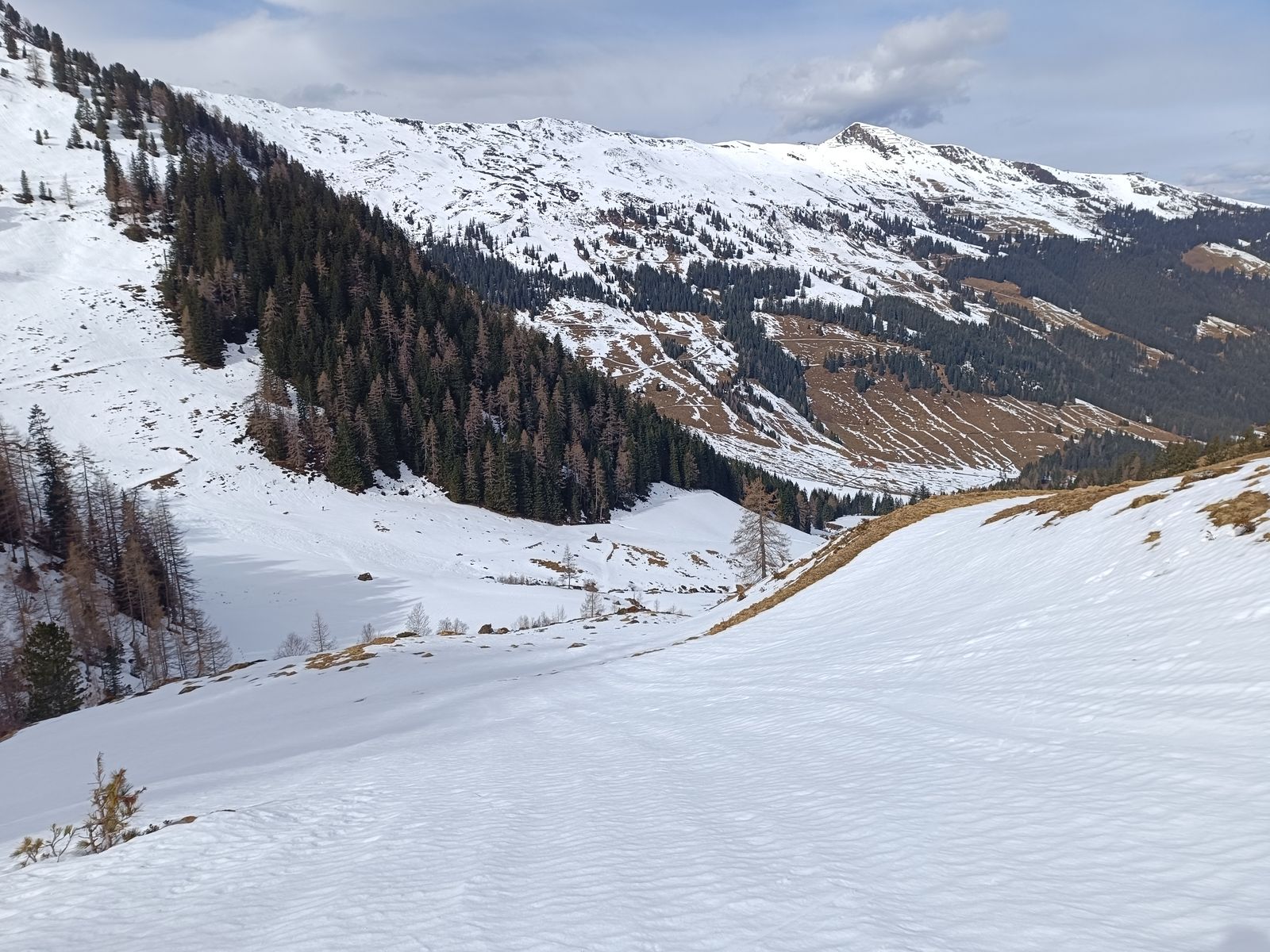 Von der Alm bin ich zunächst zum Standkopf hoch, obwohl das sehr schneearm ausschaut. Man kommt mit Gespür aber gut durch. Keinesfalls sollte man aber im nordseitigen Graben aufsteigen: Dort liegt schon viel Lawinenschnee, aber die nordseitigen Steilhänge oberhalb sind bei weitem noch nicht entladen (Gefahr von Nassschneelawinen). Im bin nicht bis zum Gipfel hoch, sondern nur bis zum Kamm, weil der Föhnsturm ab dem Kamm zum Orkan wurde und das brauch ich dann nicht. Die Abfahrt um 10 Uhr war wirklich gut: Oben interessanter Schnee - ich würde es "gefrorenen Noppenpulver" nennen - , der sich gut fahren ließ und später dann Firn bis zur Alm. Da es früh am Tag war, bin ich noch Richtung Galtenberg hoch so weit es vom Schnee her Sinn macht (bis etwa 2200m). Oberhalb wie fast immer zu wenig Schnee. Für den Aufstieg und die Abfahrt muss man wegen Schneemangels auf dem Normalweg zunächst die Route zum Kleinen Galtenberg nutzen bis man auf eine Forststraße zur Farmkehralm trifft. Weil es mittlerweile etwas bewölkter war, hat der Hang über der Alm nicht aufgefirnt, es war um kurz nach 12 aber sehr griffig und schön zu fahren. Weiter unten dann idealer Firn.
