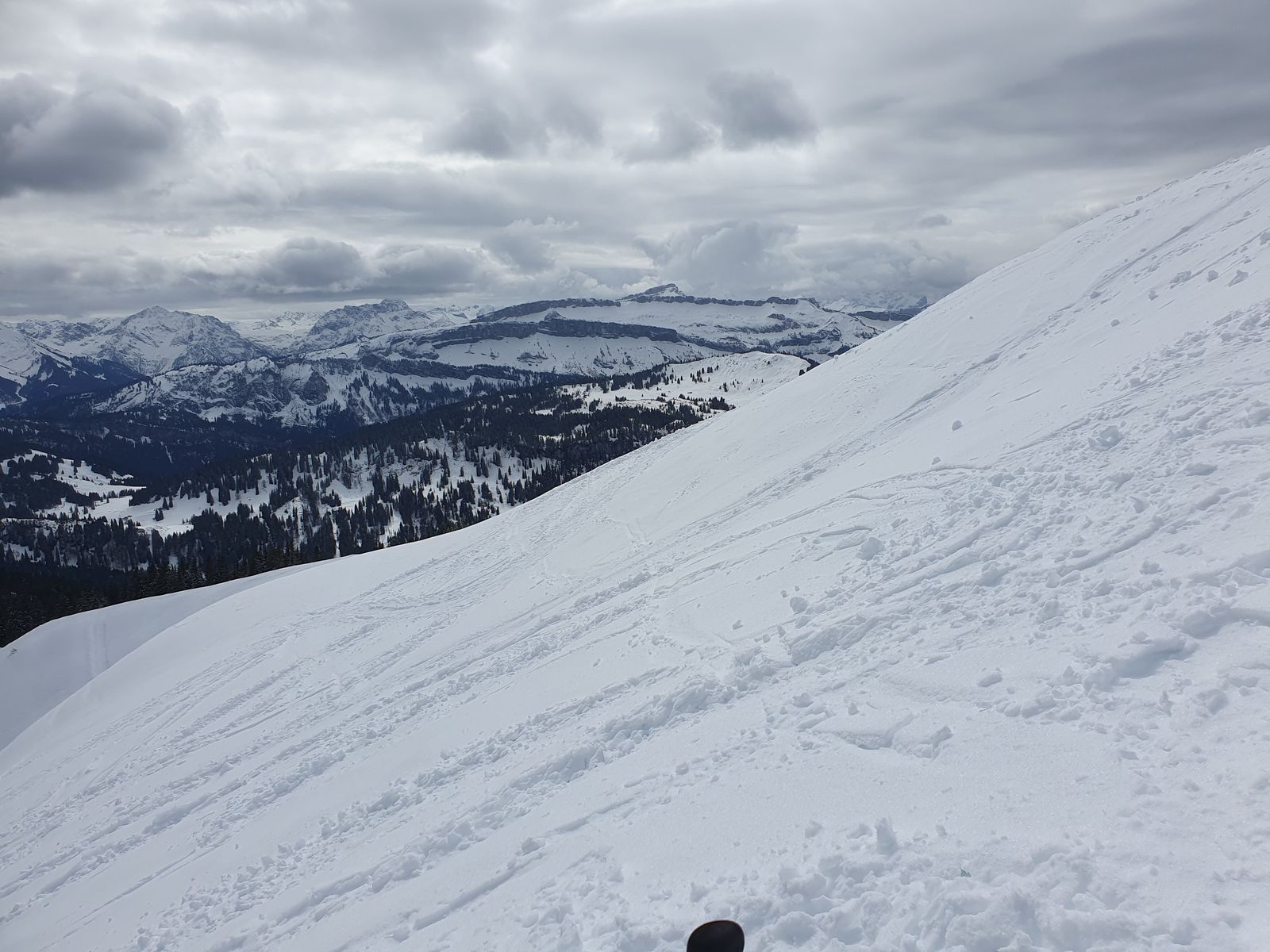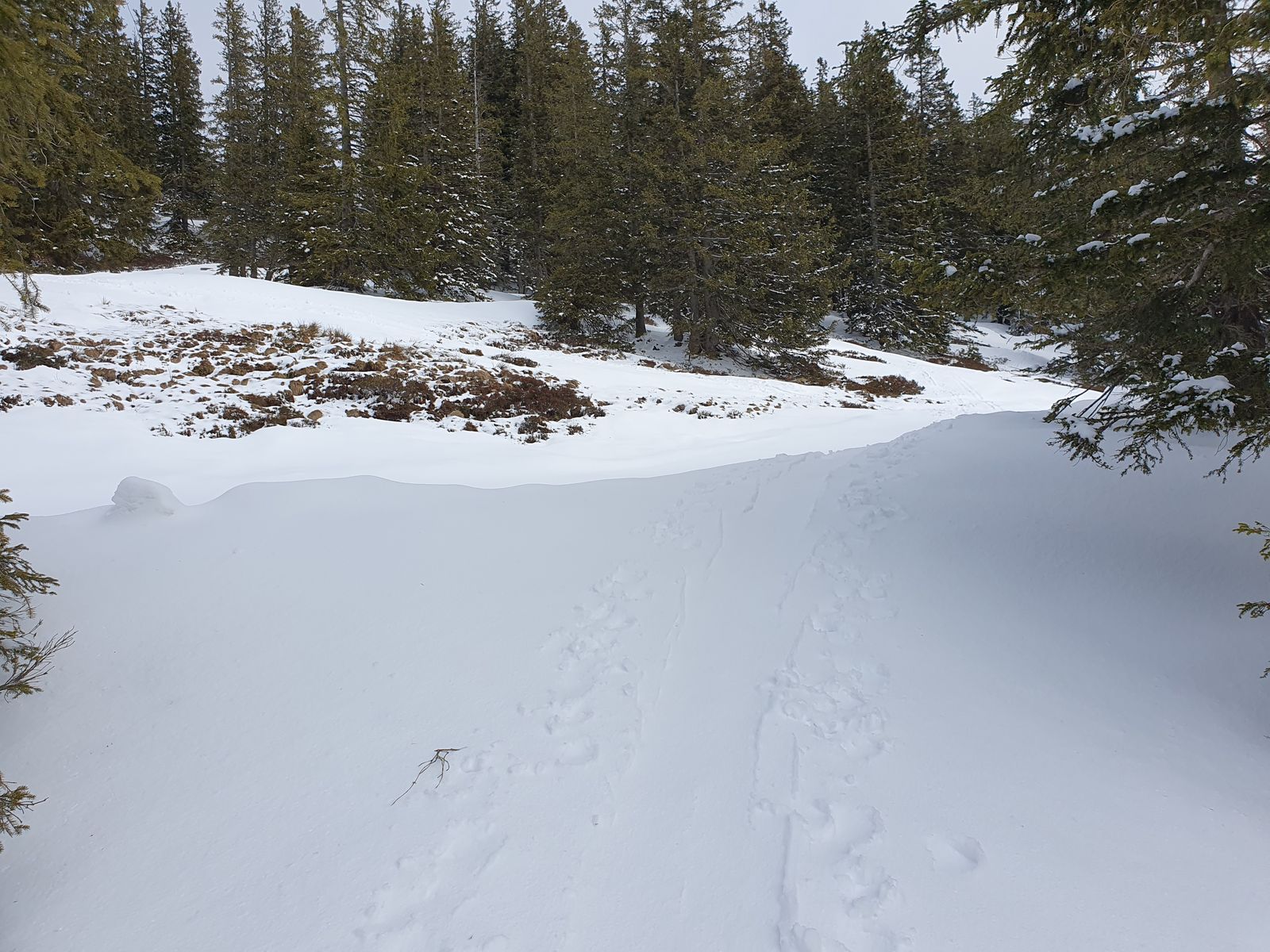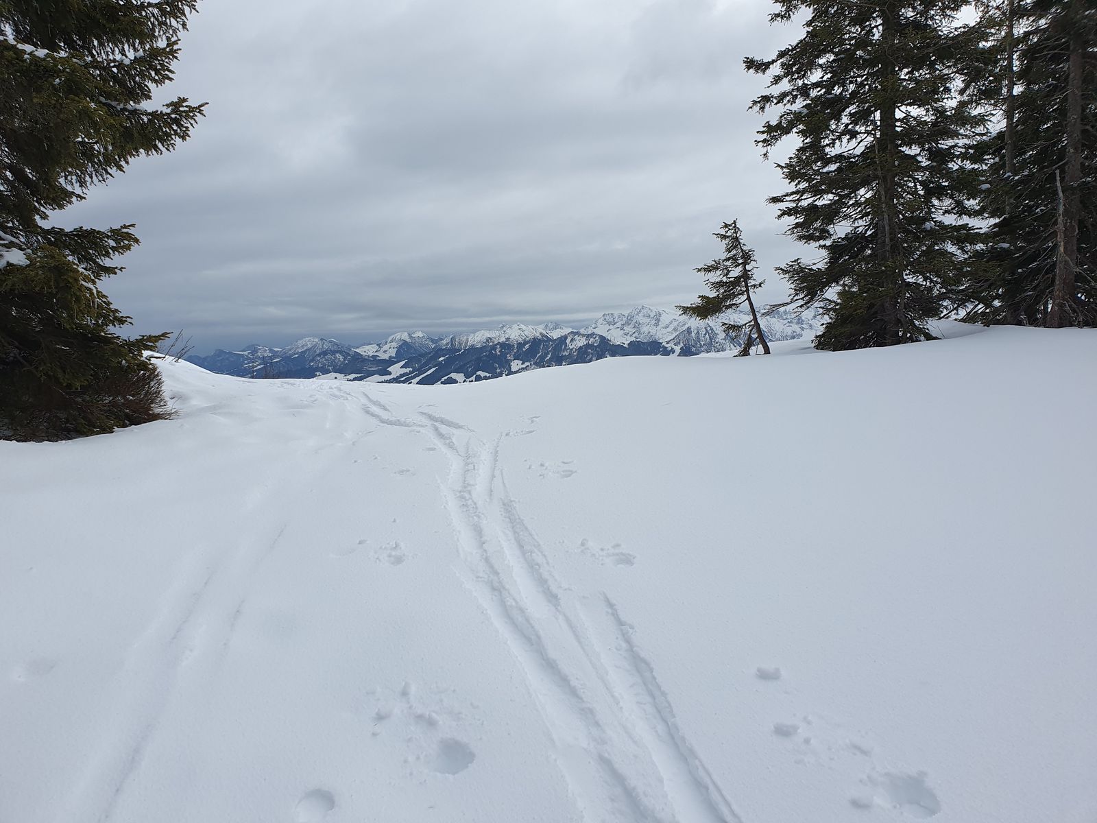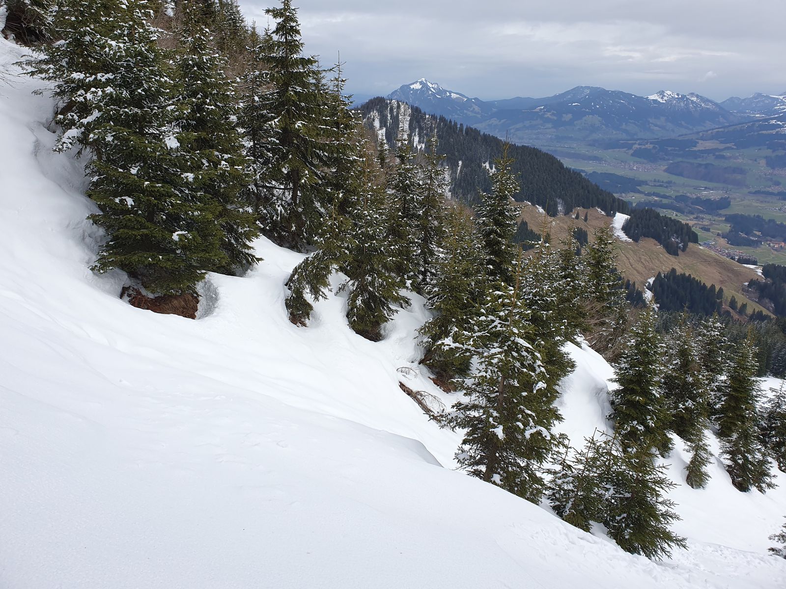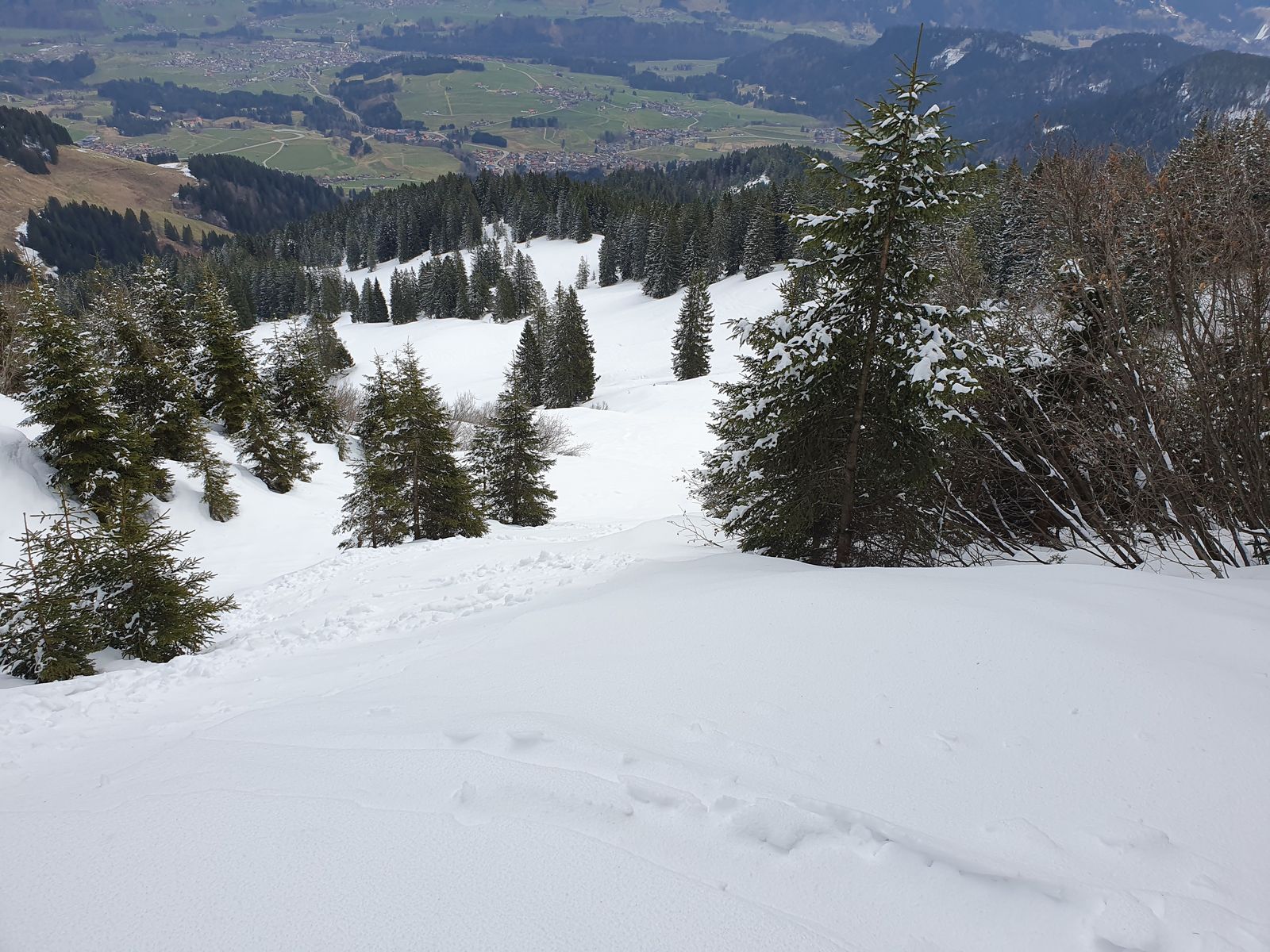 Überall genug Schnee, keine aperen Stellen, auch das kurze enge Stück im Wald vom Wannenkopf zum Lieblingshang sehr viel Schnee. Überall eine kleine Neuschneeauflage.