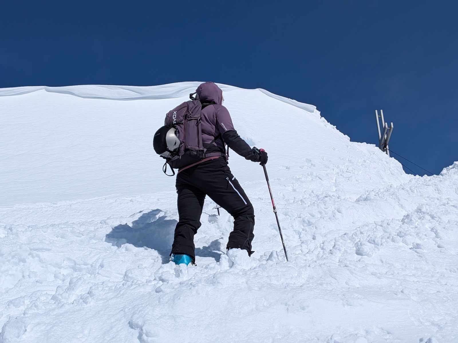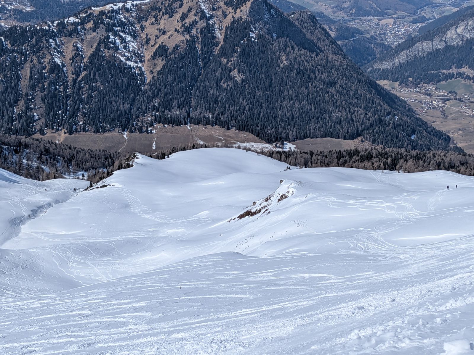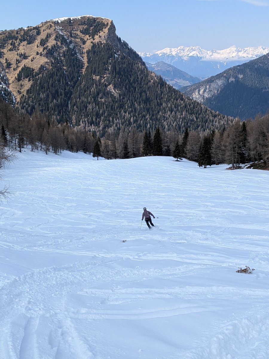 Interessante Variante (die wir nur gesehen, nicht gemacht haben): Ski zum Gipfel mitnehmen, ein Stück am Grat Richtung Rossgrubenkofel abfahren und durch die Nordflanke in die darunter liegende Mulde abfahren. Sah richtig gut aus. Aus der Mulde kann man mit einem offenbar sehr kurzen Aufstieg auf und über den Nordrücken der Vennspitze wieder auf die Normalroute zurück.