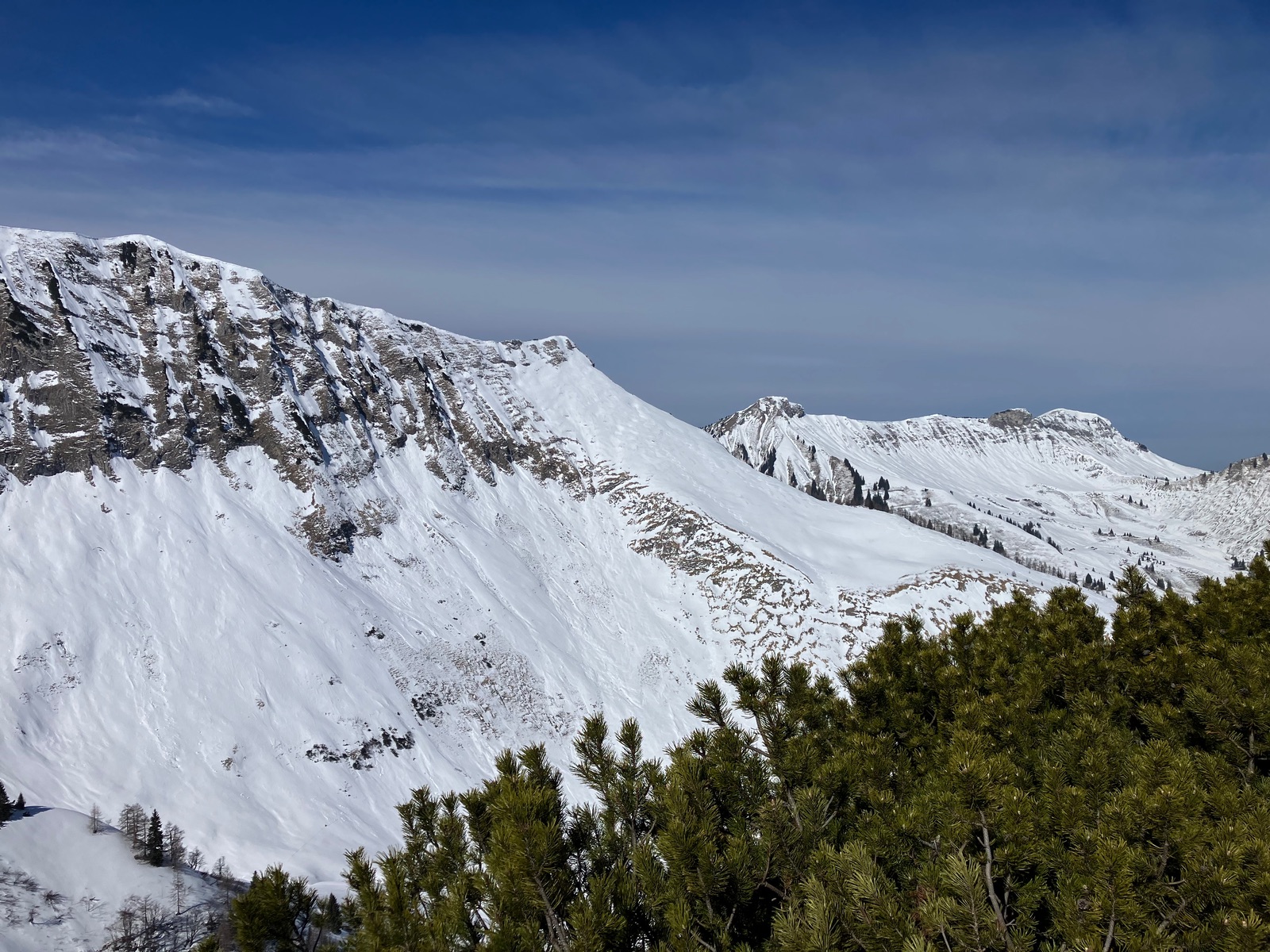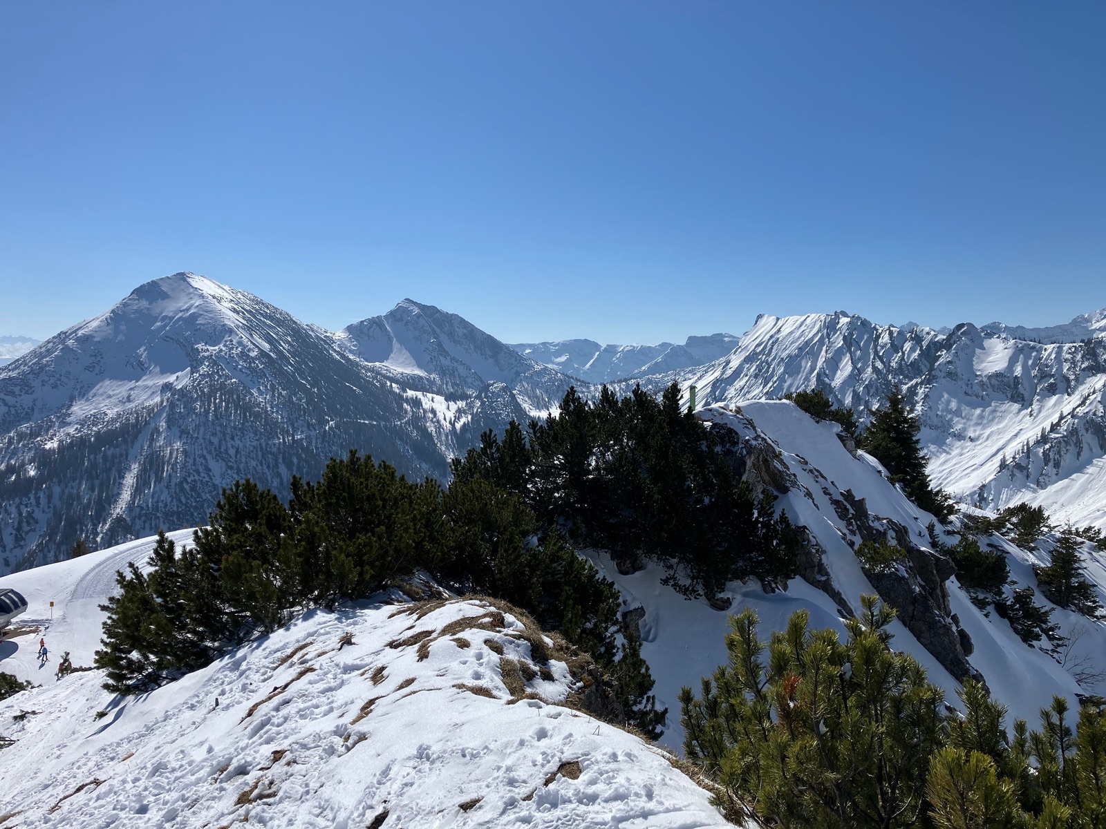 Die geöffneten Pisten sind bis auf einzelne wenige Flecken noch in sehr gutem Zustand und ein bisschen dürfte es wohl auch noch nach Ende des Skibetriebs gehen. Sehr viel Schnee liegt aber nicht, so dass die Saison hier vermutlich deutlich kürzer ausfällt als in durchschnittlichen Jahren. Im Aufstieg über die Nordroute liegt kurz nach Ende der präparierten Skipisten (beim höchsten Schlepplift) sehr wenig Schnee - ging heute noch, dürfte aber nicht mehr lange gehen. Ggf. kann man über den querenden Weg ausweichen oder muss kurz die Skier tragen. Dort abzufahren, ist sicher nicht empfehlenswert.
