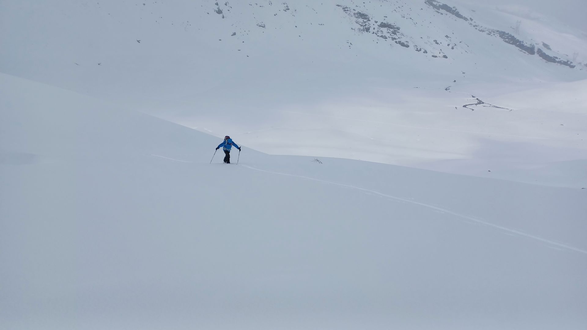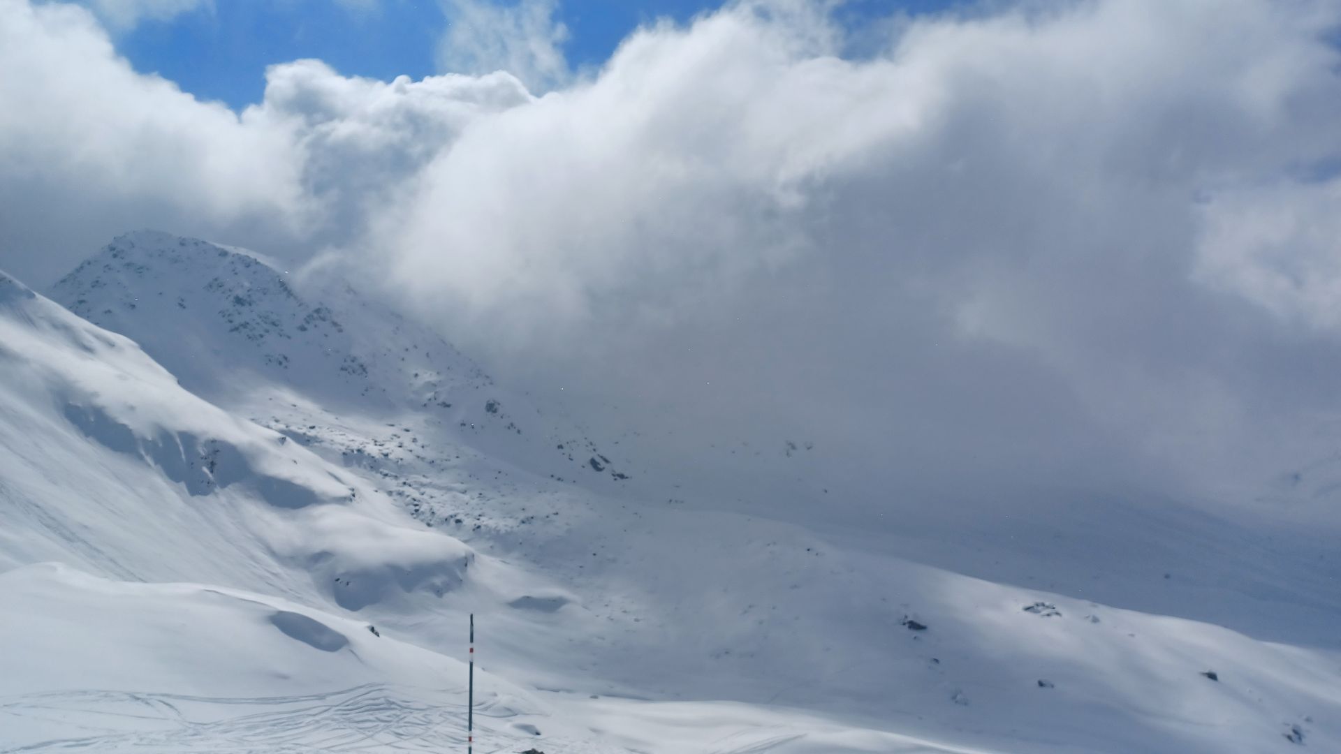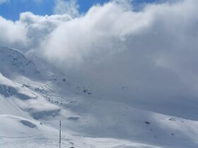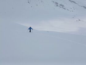 Da wir von gestern wussten, daß es in den nordseitigen Hängen noch guten Pulverschnee hat, ging es heute Richtung Piz dal Sasc. In Bivo gab's über Nacht nur homöopathisch Neuschnee, oberhalb dürften es so 10 bis 15 cm gewesen sein. Ab 2100 m war dann alles in Nebel eingehüllt, wir haben uns noch bis 2350 m hinaufgekämft und dann im Whiteout entschlossen umzudrehen. Ein Bergführer mit Gruppe ist noch weiter. Abfahrt im besten Pulver bis 2100 m hinab und anschließend sind wir noch auf den Roccabella hoch. Dieser Gipfel war den ganzen Tag über wetterbegünstigt. Allerdings war die Abfahrt im Bruchharsch dann alles andere als lustig.