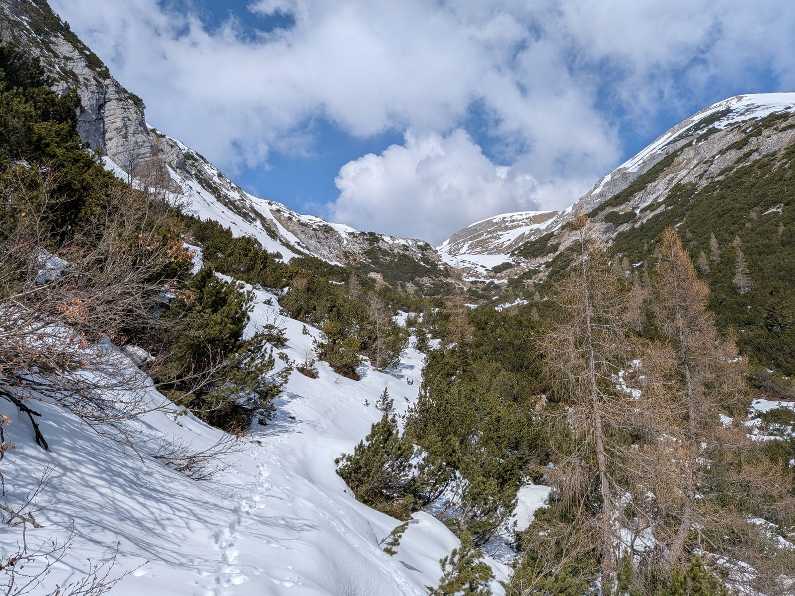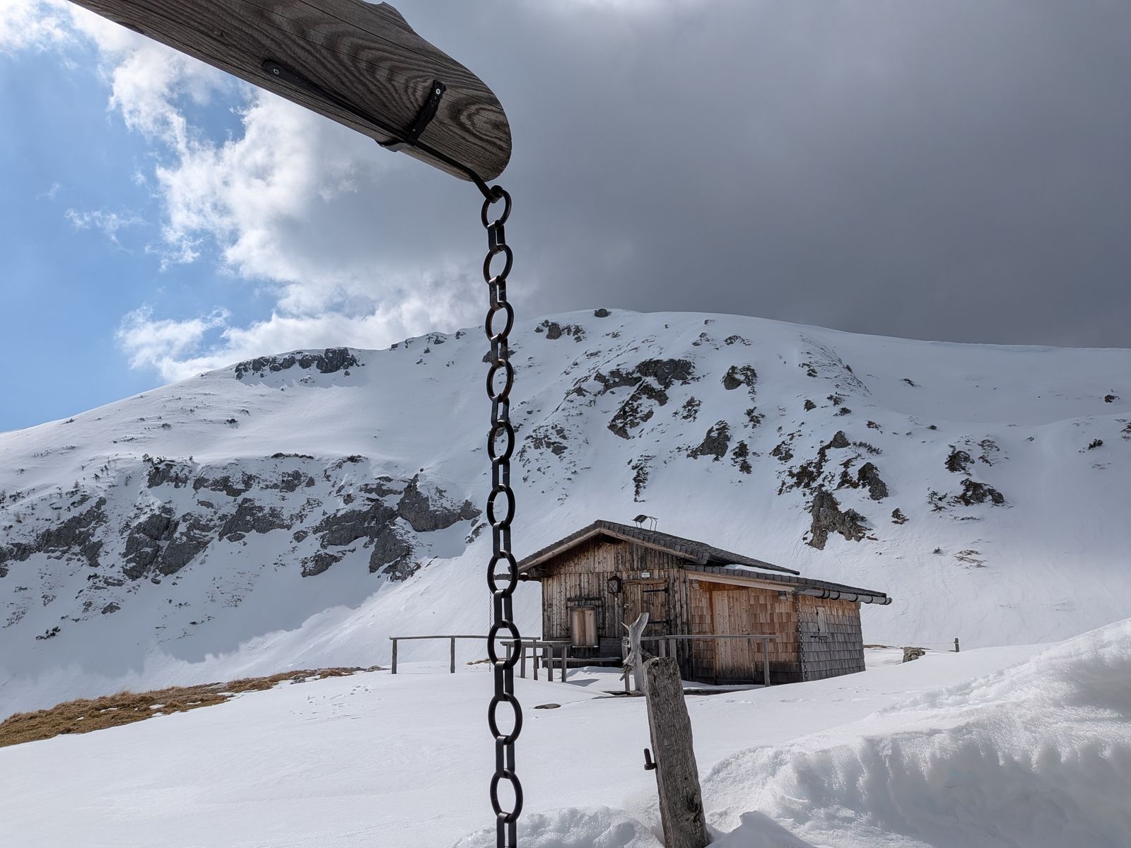Lawinengefahr: Heute keine, aber grundsätzlich ab dem Verlassen des Waldes bei etwa 1550 Metern erheblich. Man geht da erst durch ein recht steiles V-Tal und später quert man zur Alm steile Hänge. Heute lag zu wenig Schnee für gefährliche Lawinen, aber wenn es demnächst nochmal schneit, würde ich die Tour nicht empfehlen.