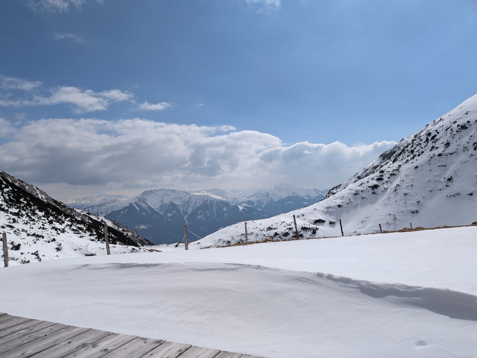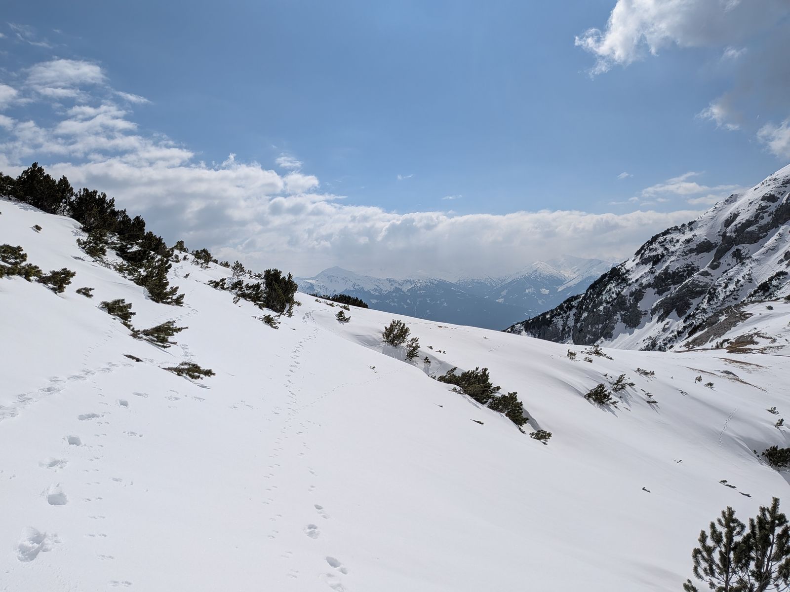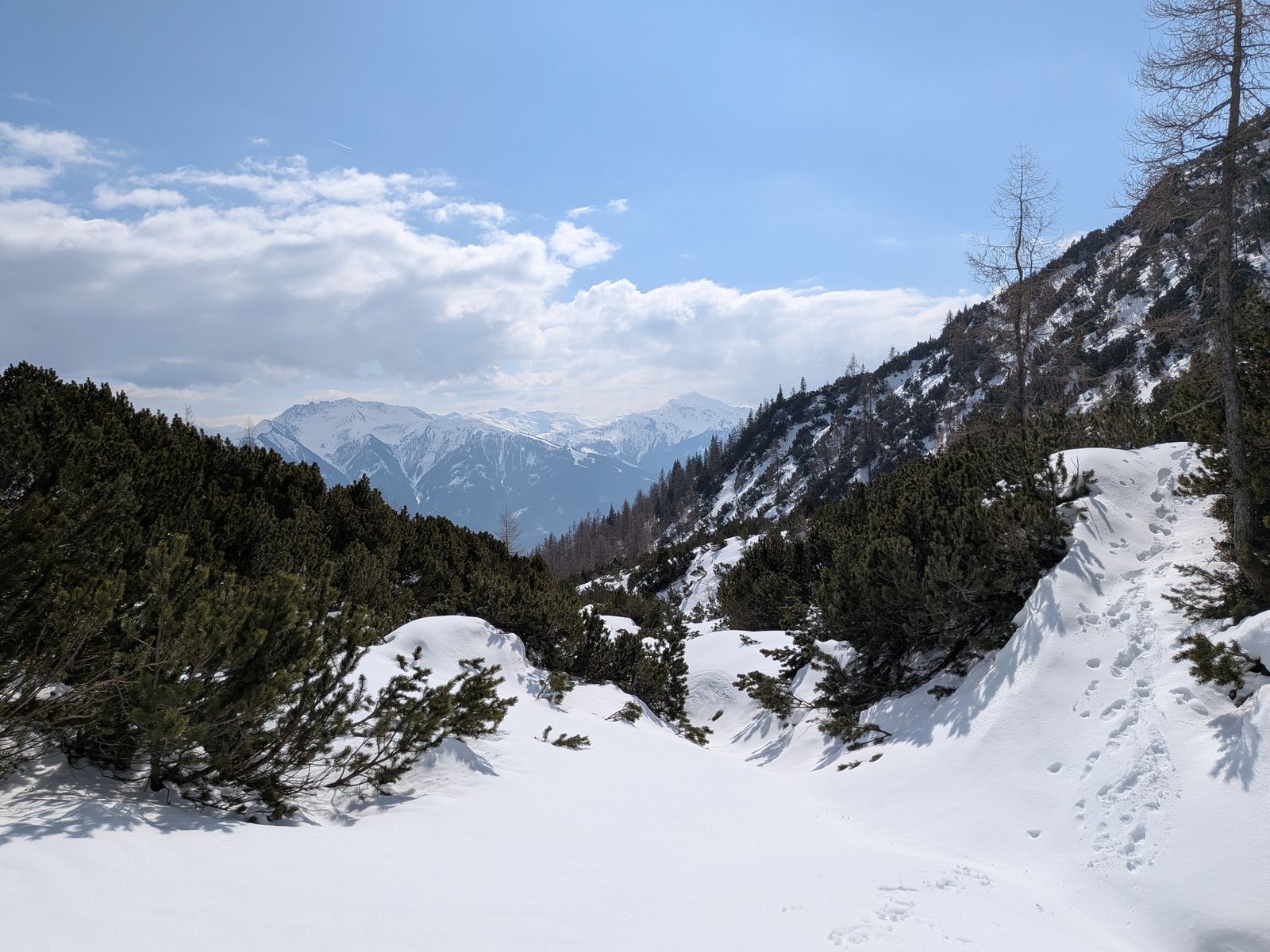Von der Alm könnte man Gipfel wie den Ochsenkopf und das Stanser Joch erreichen, aber da hätte es heute definitiv Schneeschuhe gebraucht, weil ab der Alm noch viel Schnee liegt. Und auch die Lawinengefahr wäre mir bei der Steilheit + komplett (den ganzen Winter über) jungfräulichem Gelände zu groß gewesen.