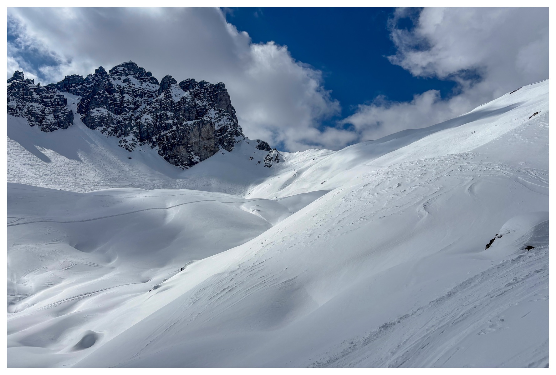 Kommt man vom inzwischen schon ziemlich frühlingsmäßigen Inntal hinauf in die Axamer Lizum, holt einen der Winter wieder ein. Die Lifte laufen, die Pisten sind tip top in Schuss. Der Parkplatz ist gut belegt. Der Aufstieg zum Widdersberg über das Lizumer Kar ist gut zum gehen - Harscheisen sind nicht notwendig. Alle Kare der Kalkkögel sind befahren. Die Abfahrt war im oberen Bereich des Widdersberges manchmal etwas gewöhnungsbedürftig - zwischen Pulver, fest und schon leichtem Auffirnen waren teilweise nur wenige Meter, aber das gehört zum normalen Skitourenprogramm. Die Abfahrt durch das Lizumer Kar ist regelrecht pistenmäßig eingefahren. Schnee hat es genügend!