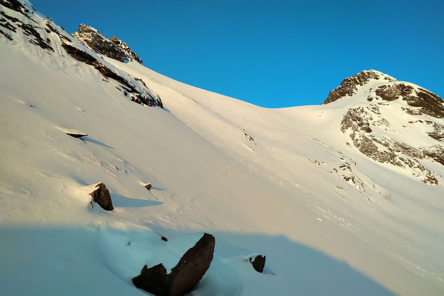 Ich bin am Samstag noch ein Stück Richtung Breiter Grieskogel aufgestiegen, um die Schneeverhältnisse anzuschauen und um am nächsten Morgen die Route schneller im Dunkeln zu finden (ich laufe sehr ungern nur einem GPS-Track nach). Durch die Länge der Tour war bei den Abfahrten sowohl Pulver, normaler Schnee, als auch Firn dabei ![]()
